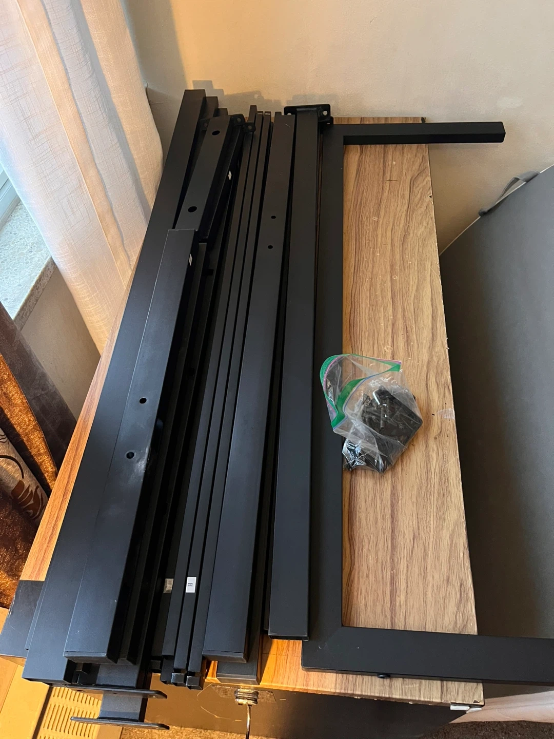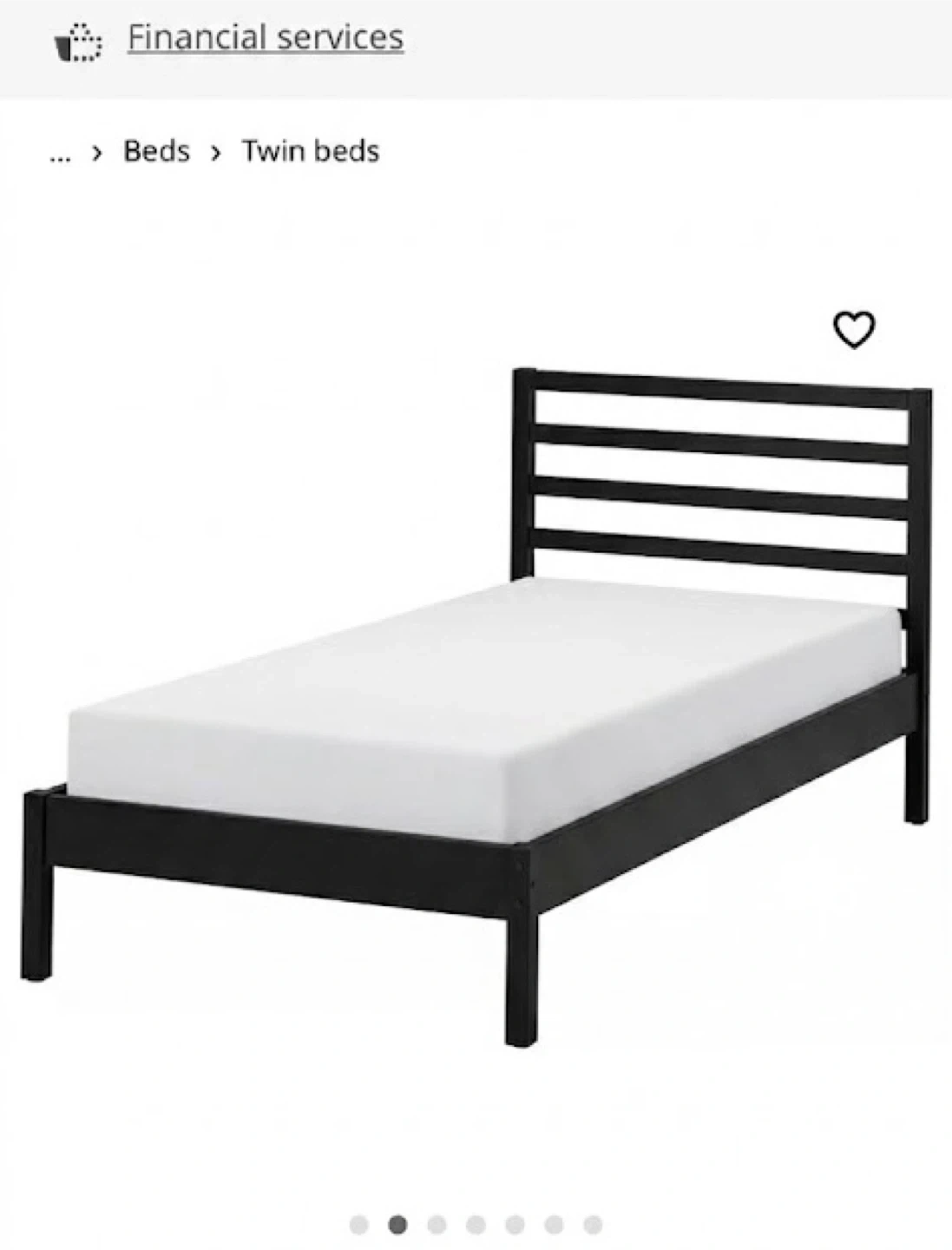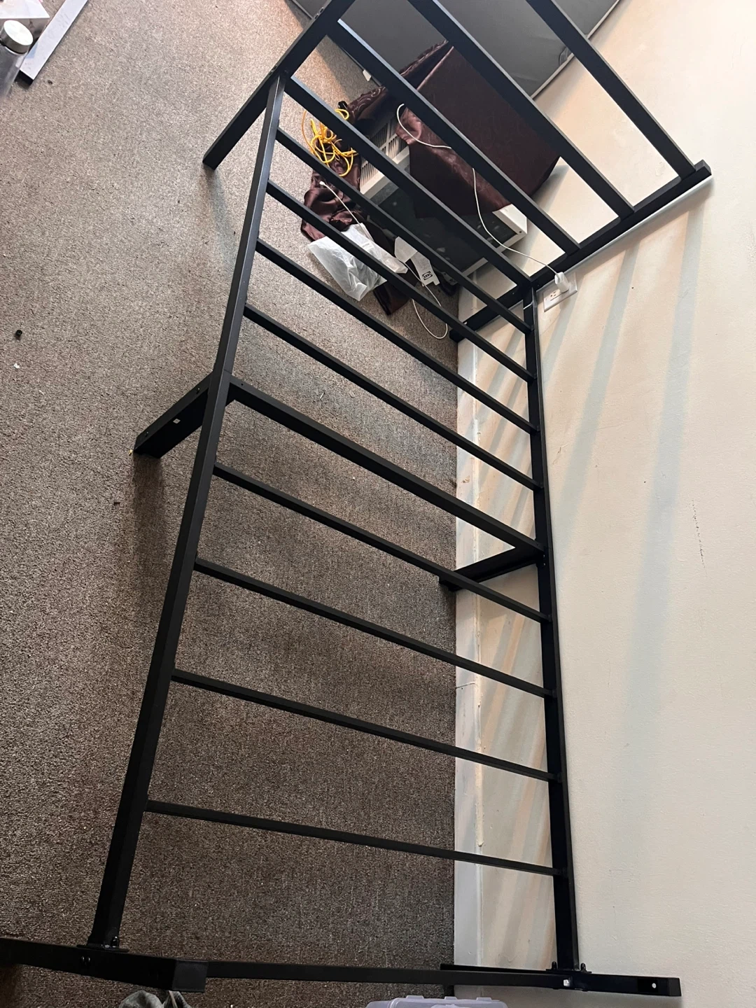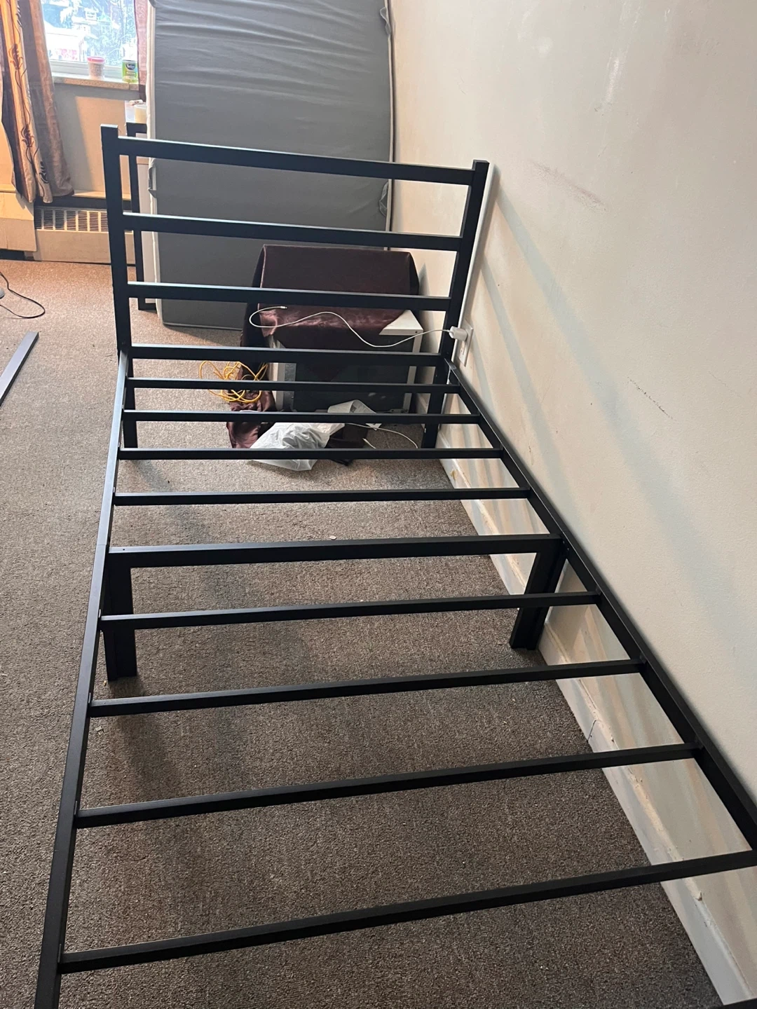 This is a black metal IKEA twin bed frame. It's made of durable metal and includes all the hardware for assembly. The frame is designed for easy setup. It has been disassembled for you to pick up.