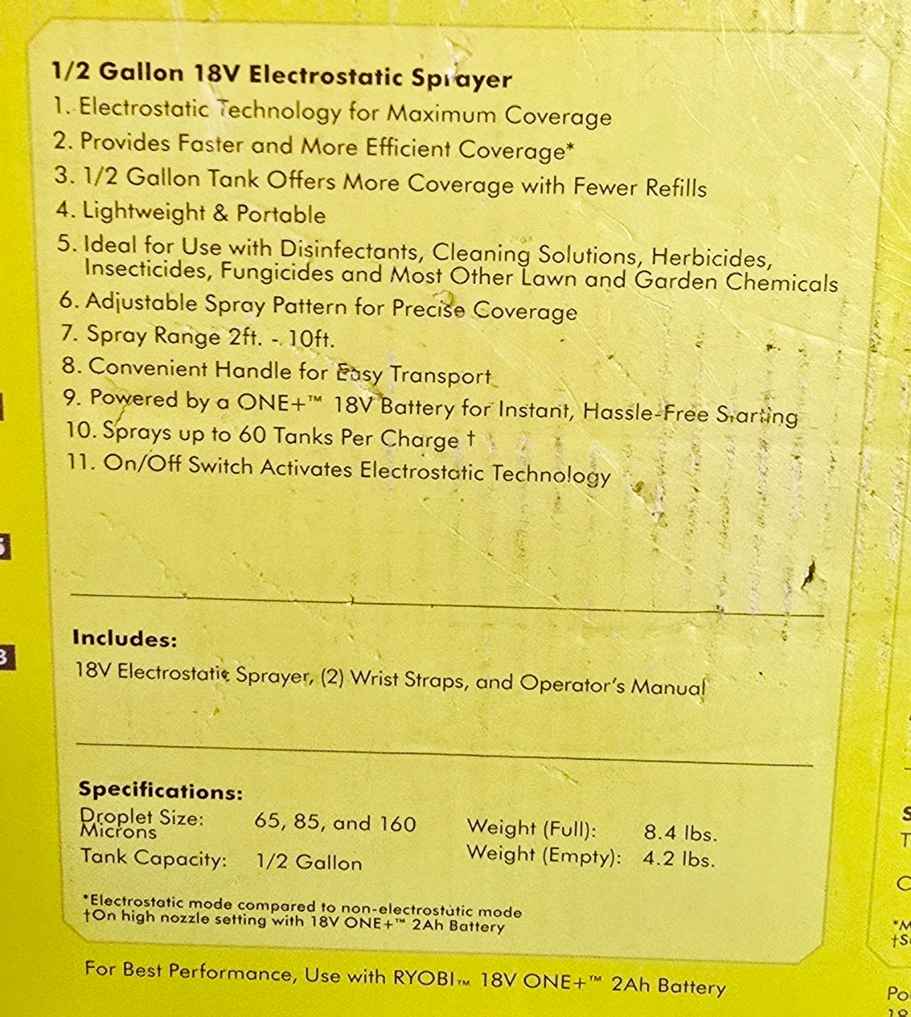 Ryobi ONE+ 18V 1/2 Gallon Electrostatic Sprayer - NEW!