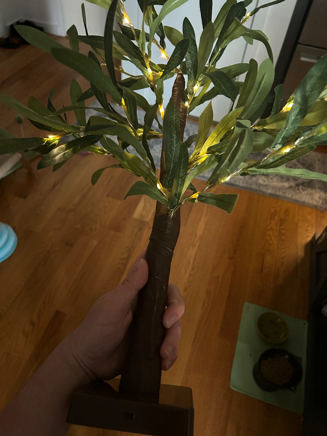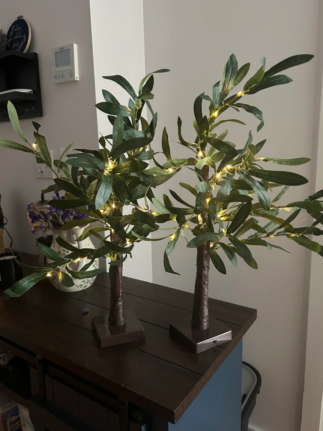 Fake olive trees with twinkle lights that give a nice soft glow. $10 for both or $7/each. Battery powered with AA batteries (included). Branches are adjustable.