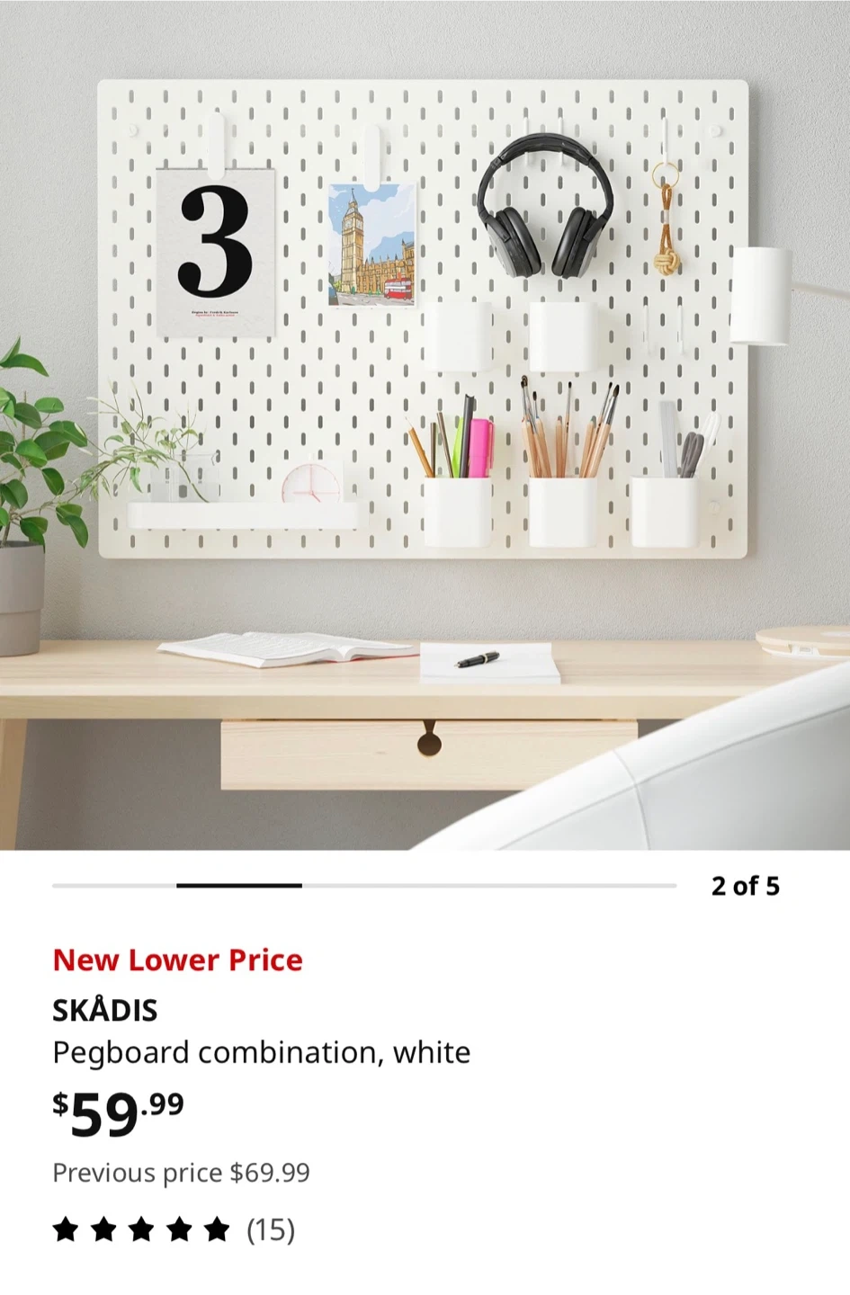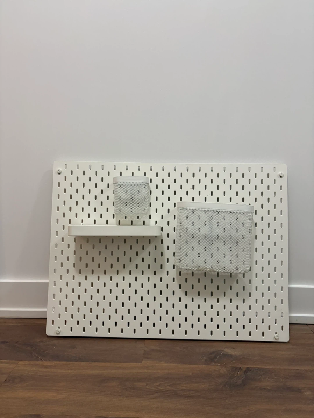 White SKÅDIS pegboard combination with shelf and two containers. This versatile pegboard system helps organize your space! It's made of powder-coated steel.