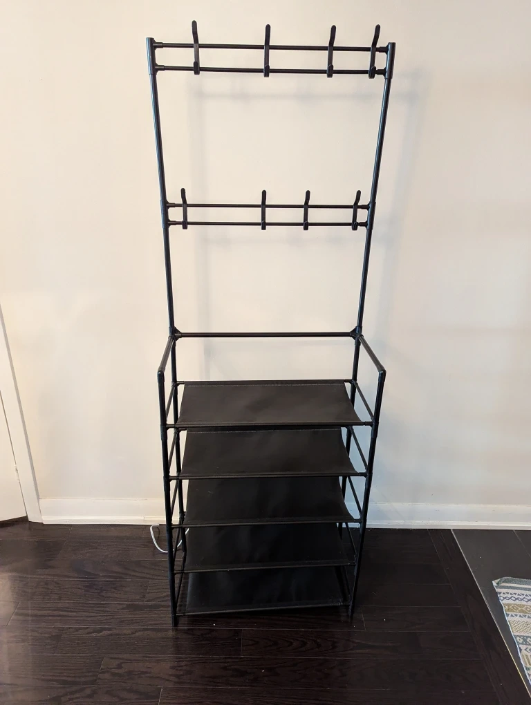 Looking to declutter your entryway? I'm selling this hall tree featuring a sleek black frame! It includes a top section with hooks for coats and hats, plus a handy shoe rack at the bottom. Perfect for keeping things organized!