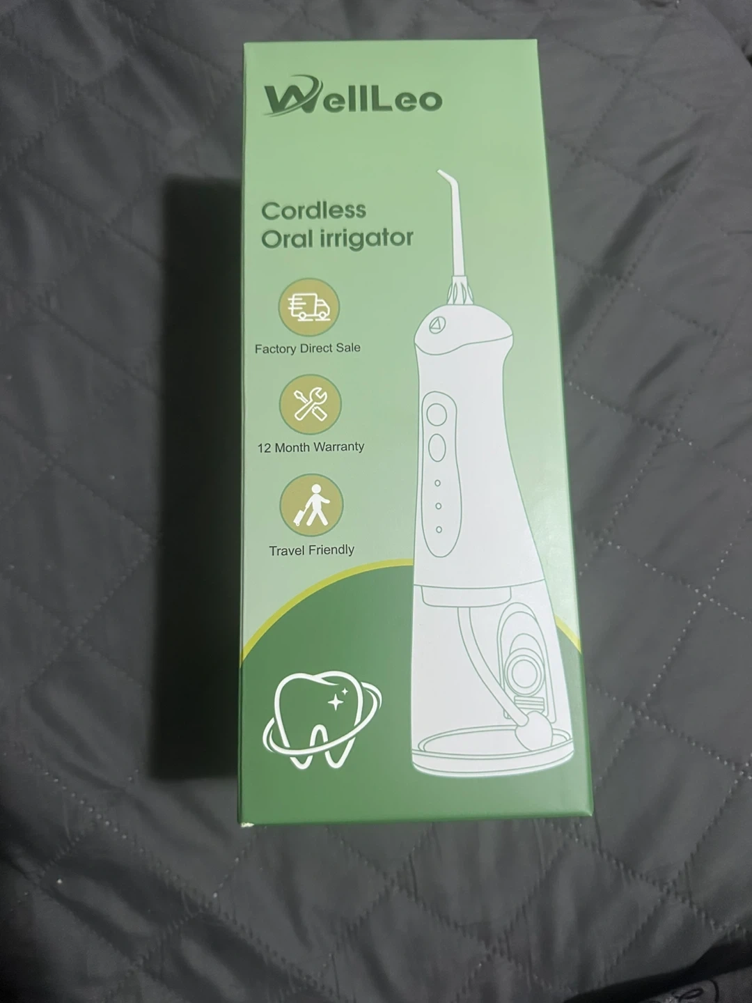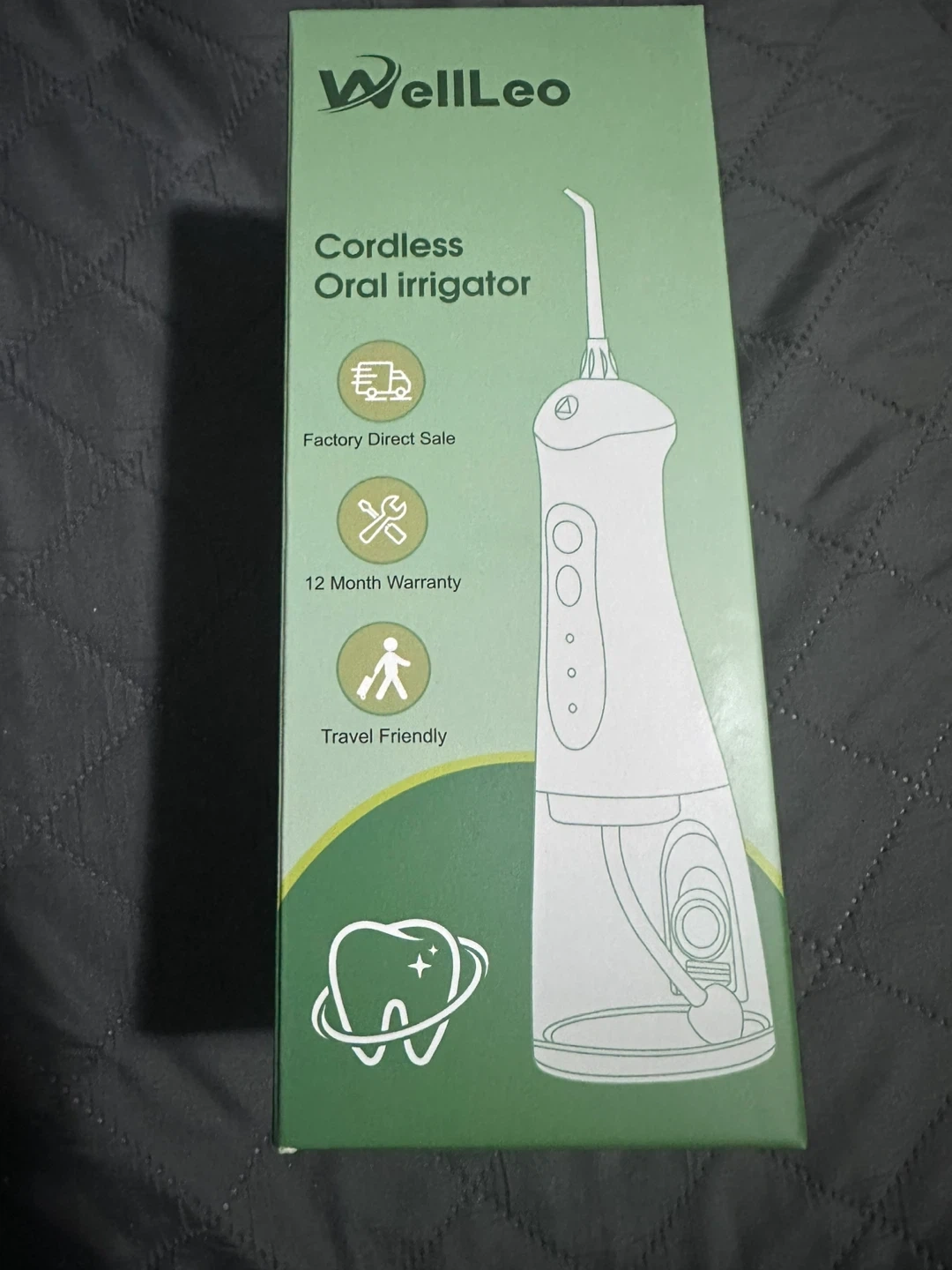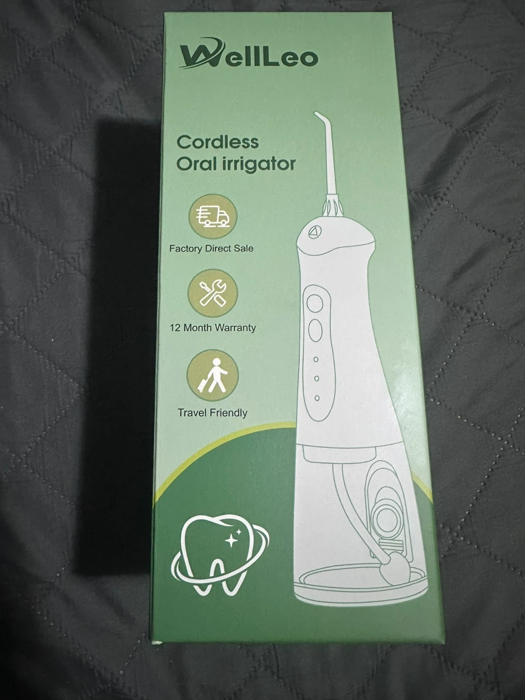 WellLeo cordless oral irrigator. It's travel friendly and comes with a 12-month warranty. This device is great for maintaining oral hygiene on the go!