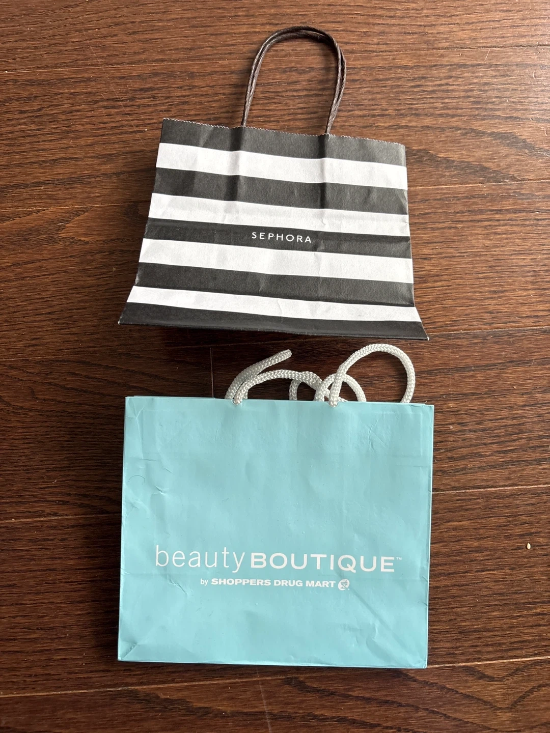 Two small paper shopping bags. One is from Sephora with black and white stripes. The other is a light blue bag from Beauty BOUTIQUE by Shoppers Drug Mart. Perfect for small gift packaging!