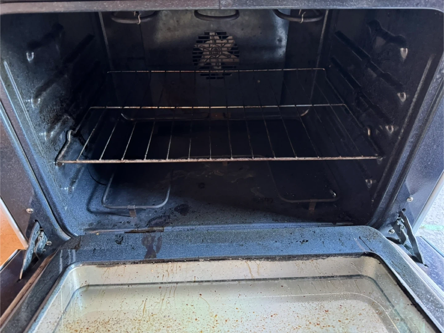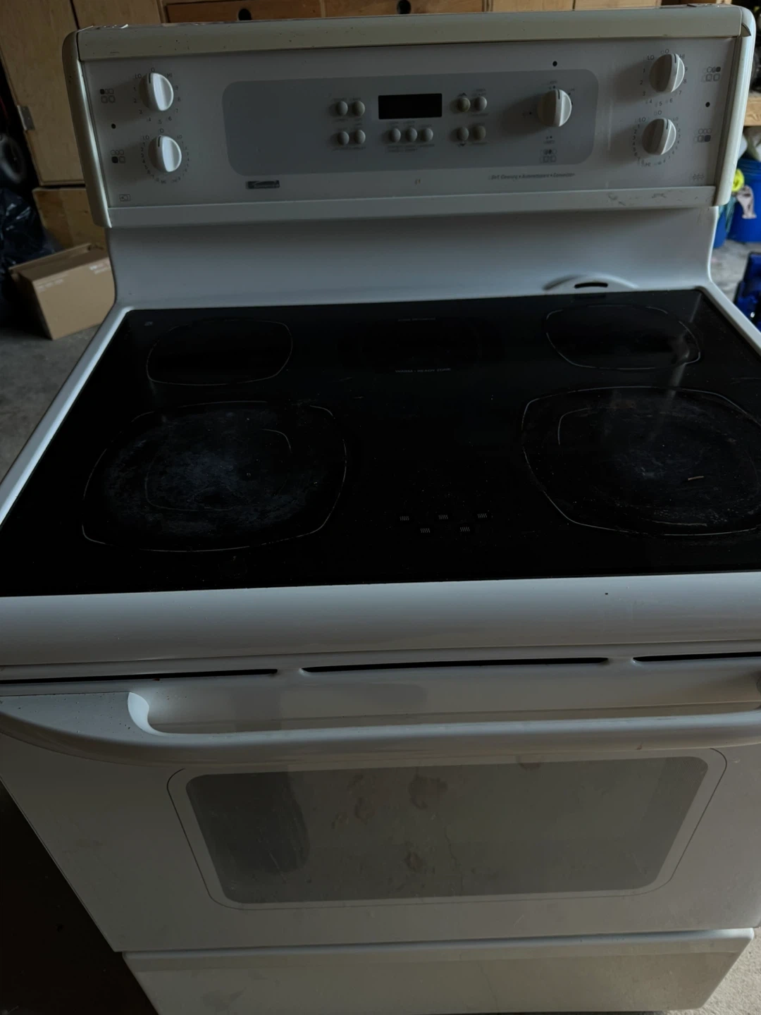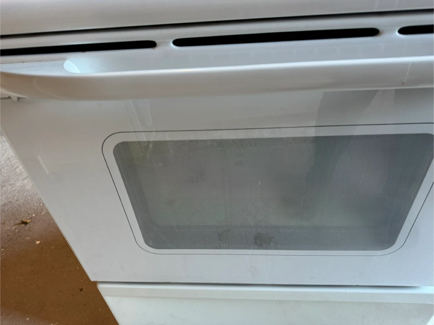 White electric stove with a four-burner cooktop and an oven. The oven has two racks inside. It's a standard-sized appliance.