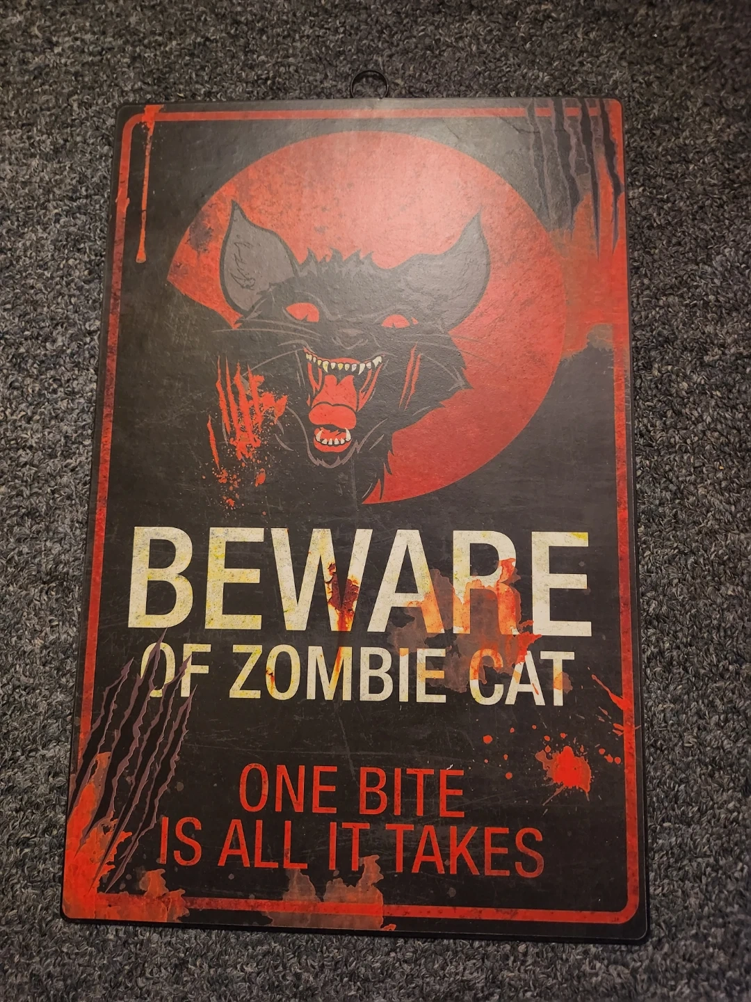 This spooky novelty sign features a scary zombie cat design. "Beware of Zombie Cat. One bite is all it takes." is printed on it. It's a fun decoration for Halloween parties or spooky displays! This is a great piece of home decor for any cat owner!