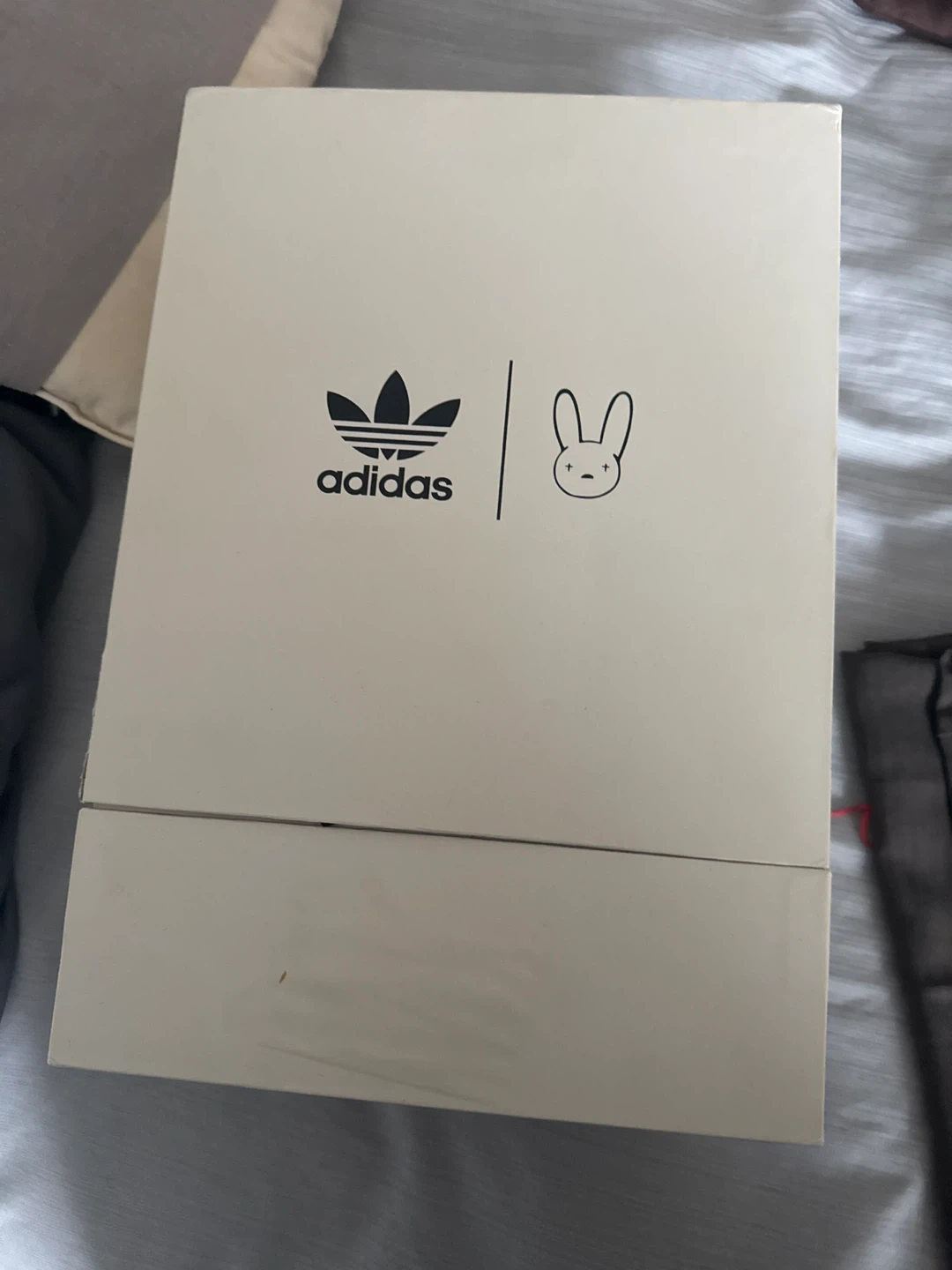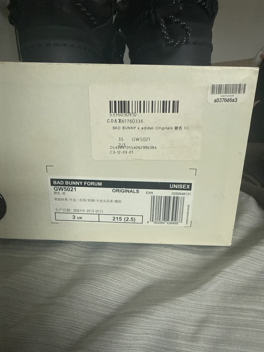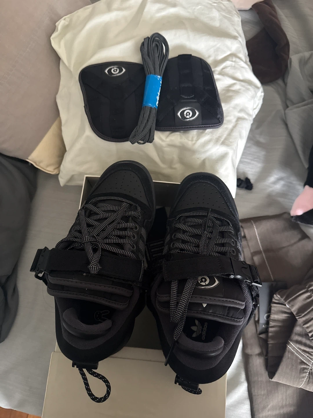 Black Adidas x Bad Bunny Forum sneakers. Includes extra laces and protective covers. Production date: July 2021.