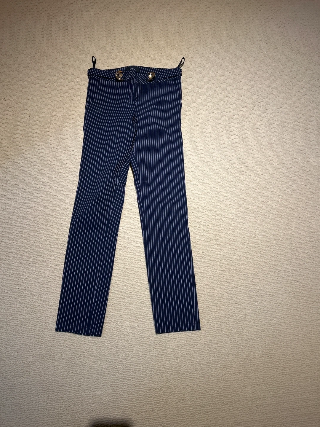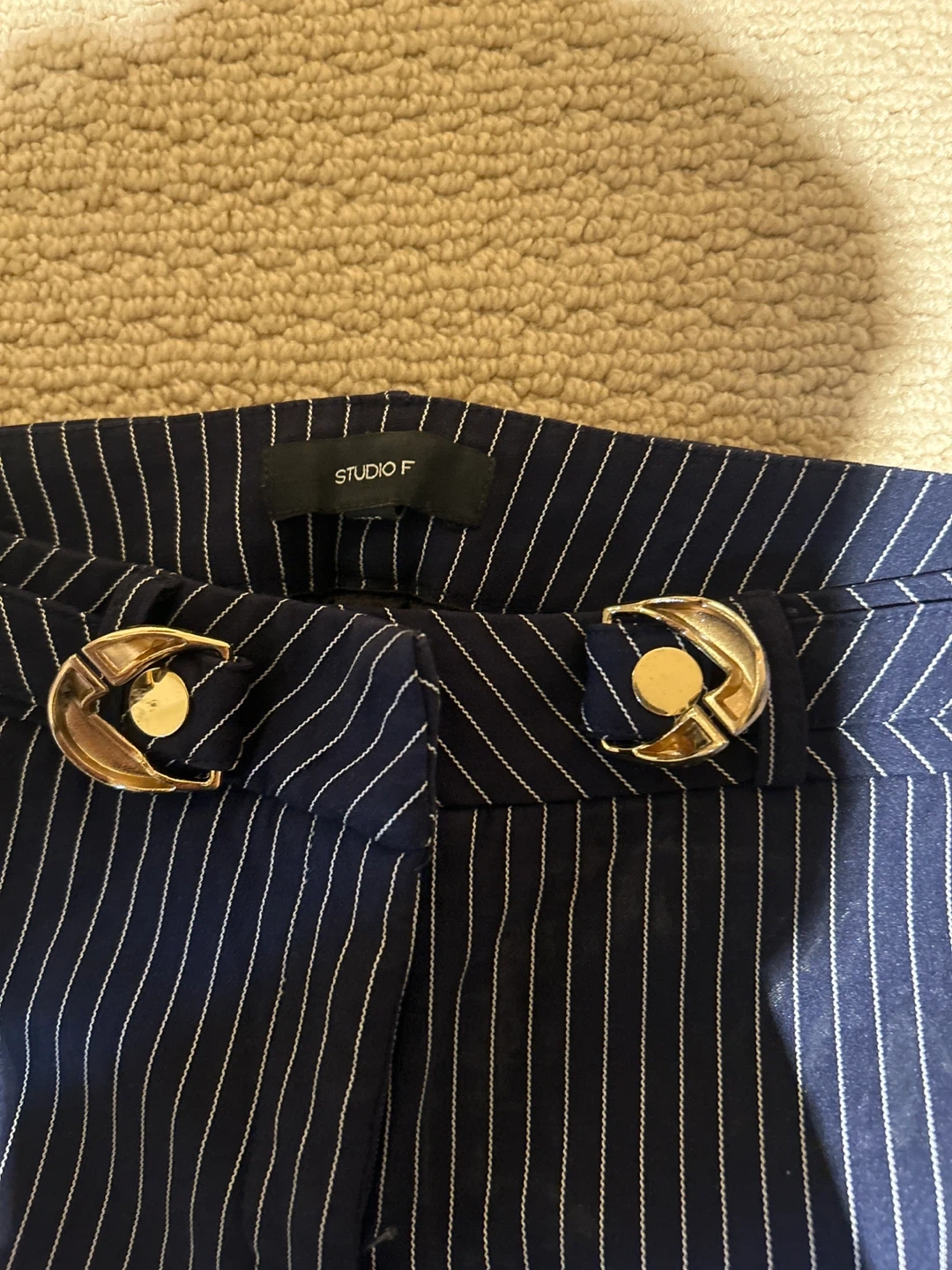 These STUDIO F navy pinstripe pants feature a classic design with stylish gold buckle accents at the waist. They're a size medium, offering a polished look. Made for versatility, these trousers can be dressed up for work or down for a casual outing.