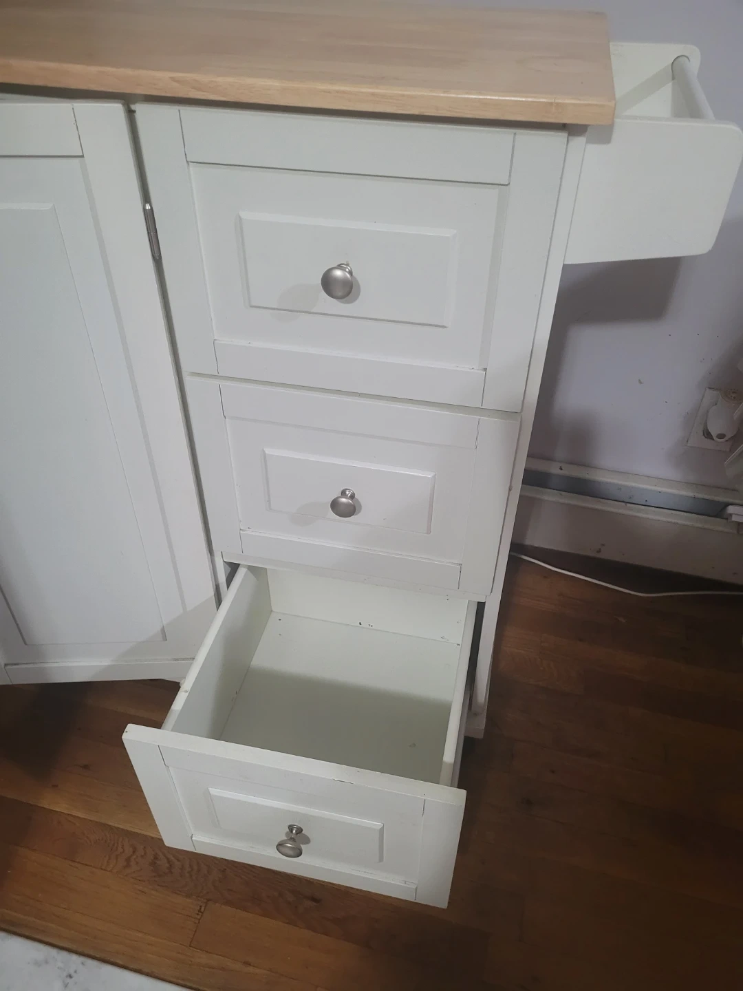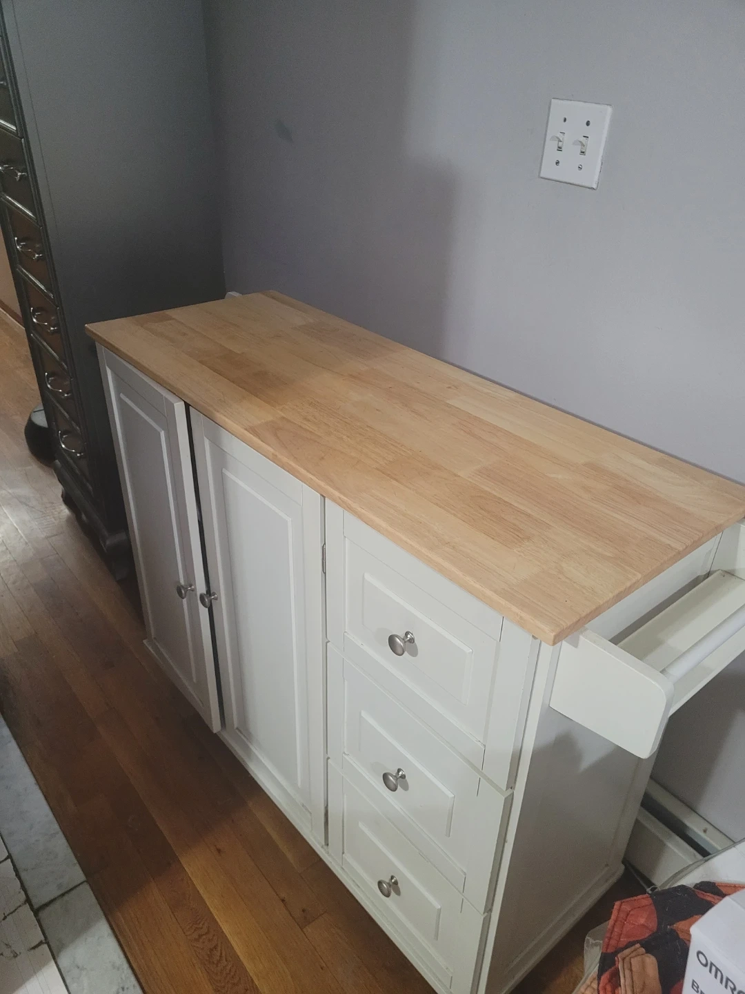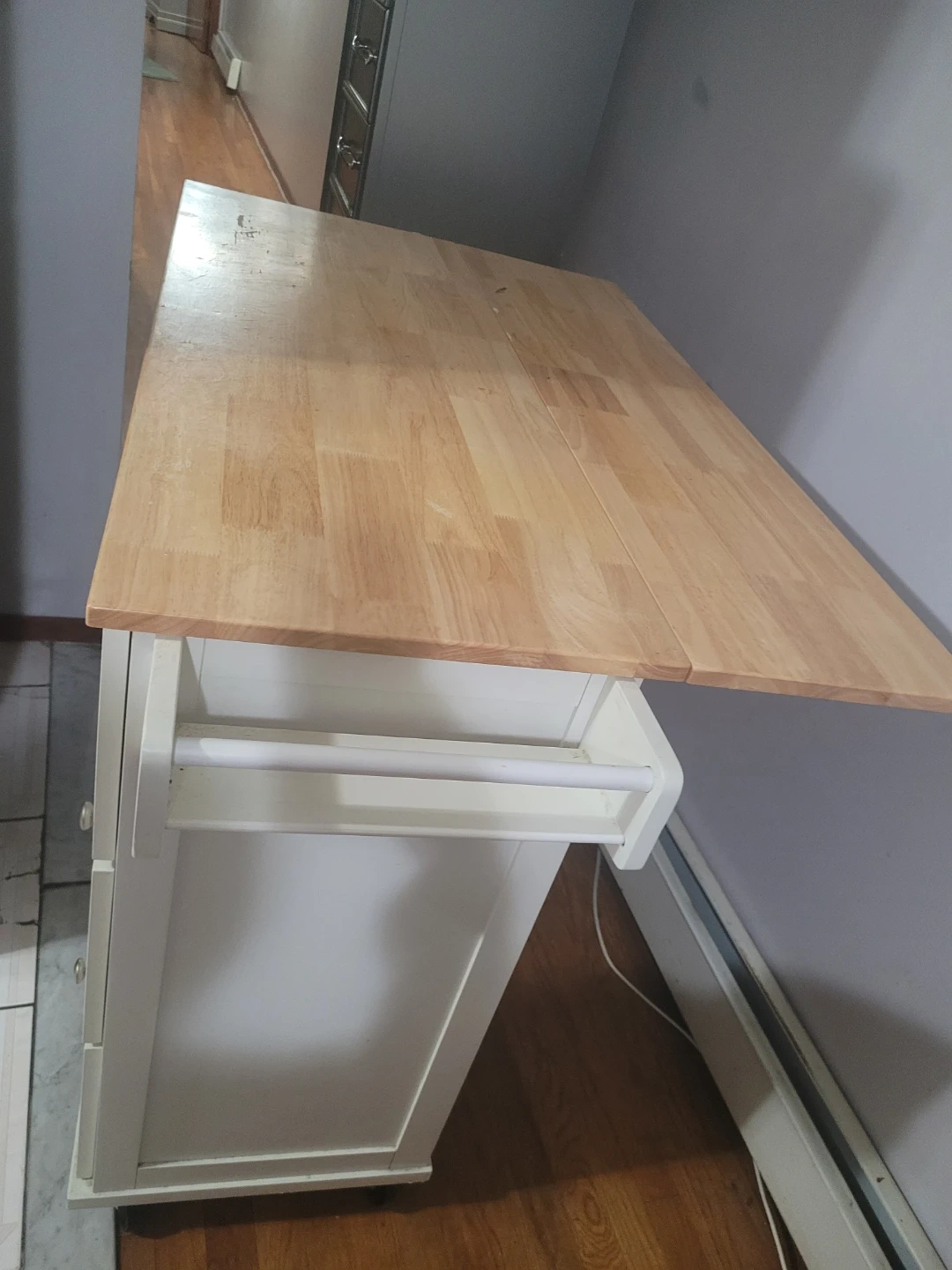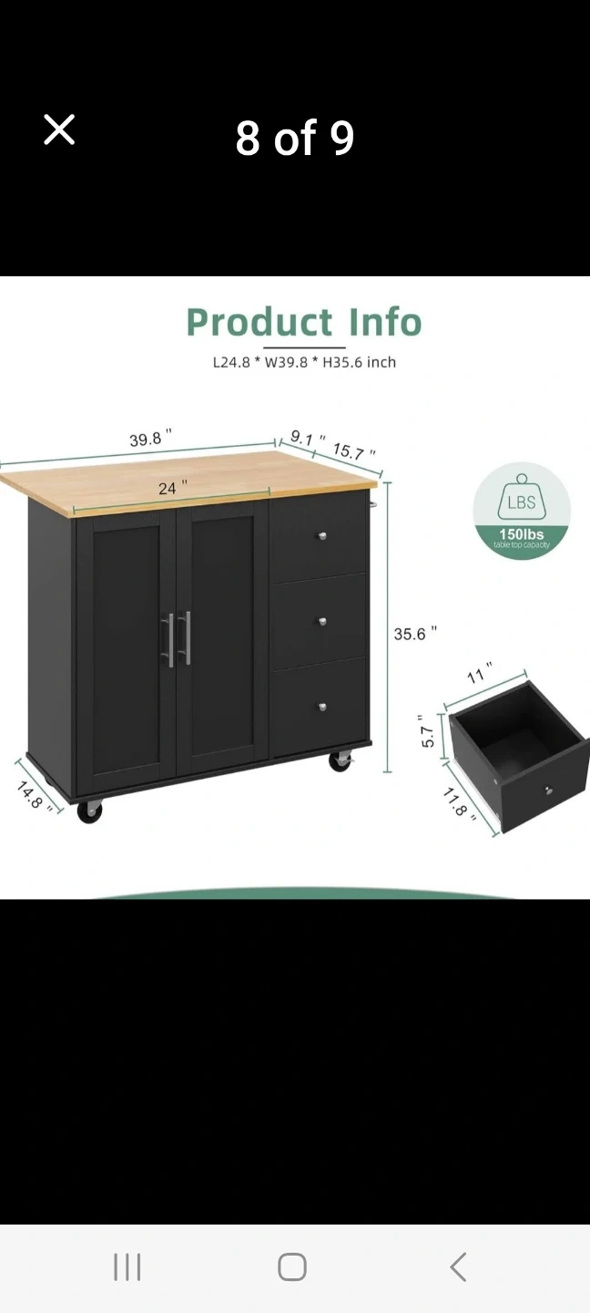 This kitchen island cart features a butcher block top and multiple storage options. It includes two cabinets with adjustable shelves and three drawers for organization. The cart also has a side towel rack and wheels for easy mobility. Dimensions: L24.8" x W39.8" x H35.6".