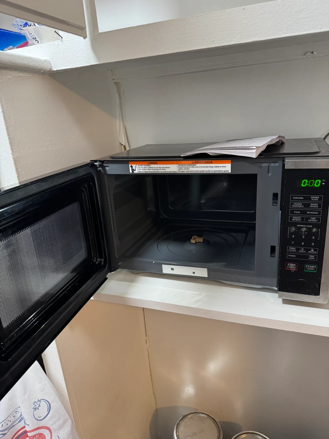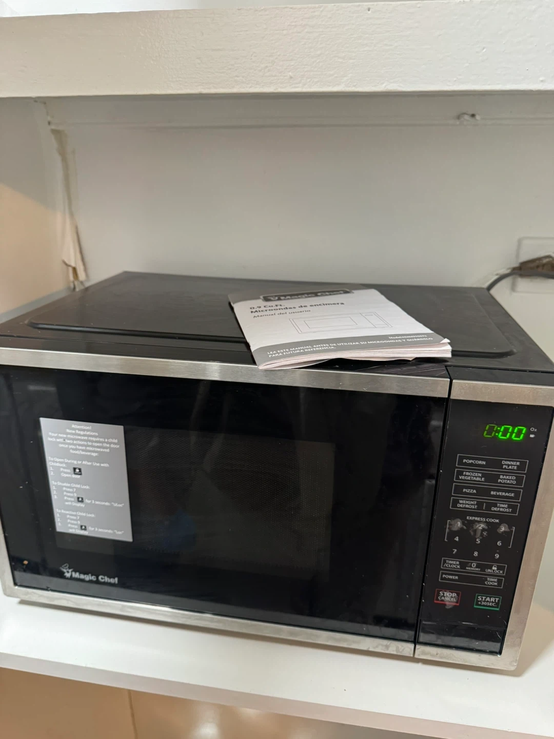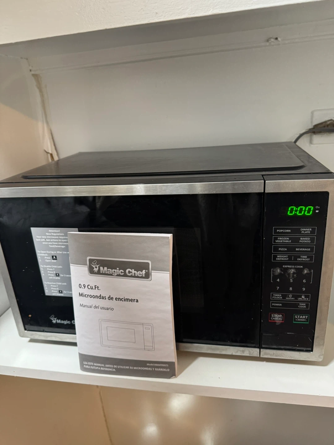 This is a Magic Chef microwave. It's a 0.9 cu. ft. model. It features several preset cooking options like popcorn, pizza, and baked potato.