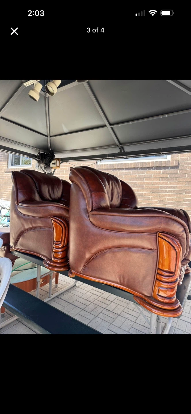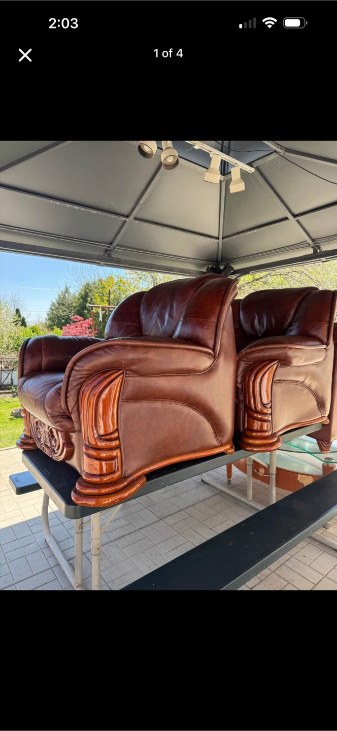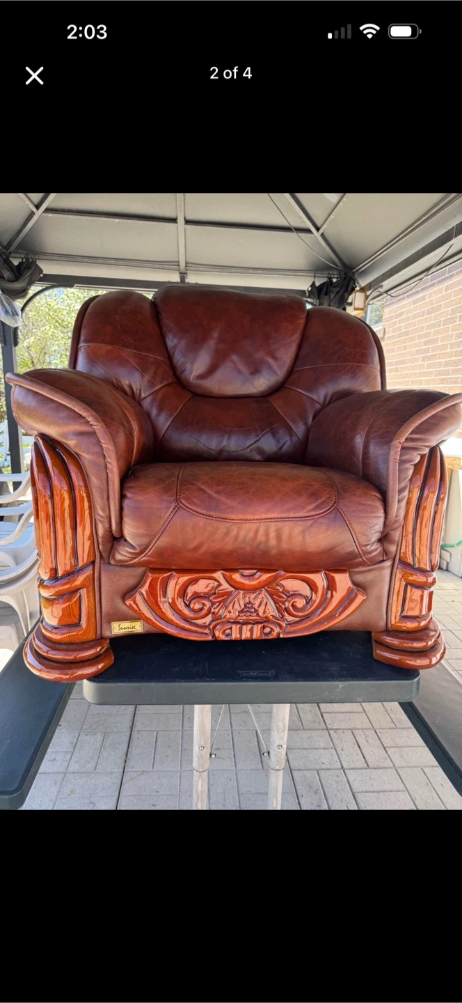 Beautiful brown leather armchair with detailed wood carvings and accents. This chair offers a classic and luxurious look for any living space. It's crafted with comfortable upholstery and a sturdy frame.