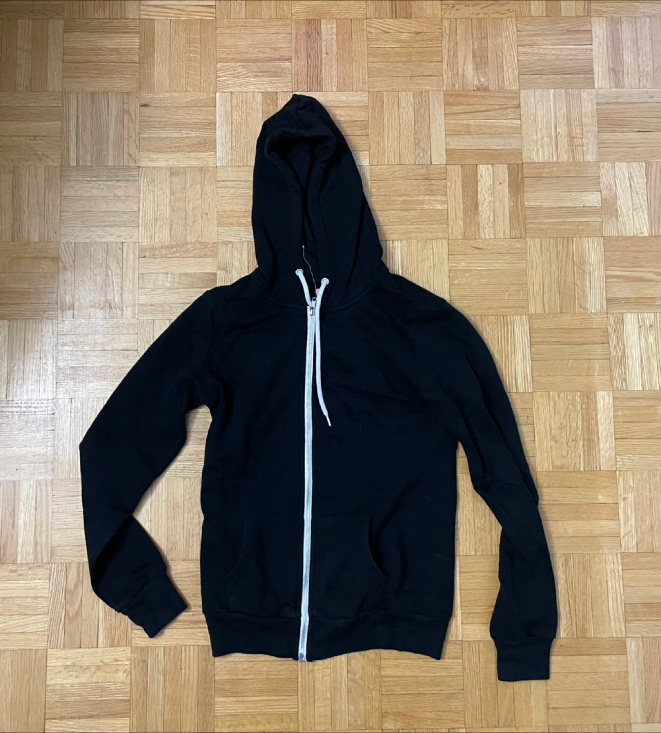 Selling a black zip-up hoodie. It's in great condition and ready for a new home! Perfect for layering or wearing on its own