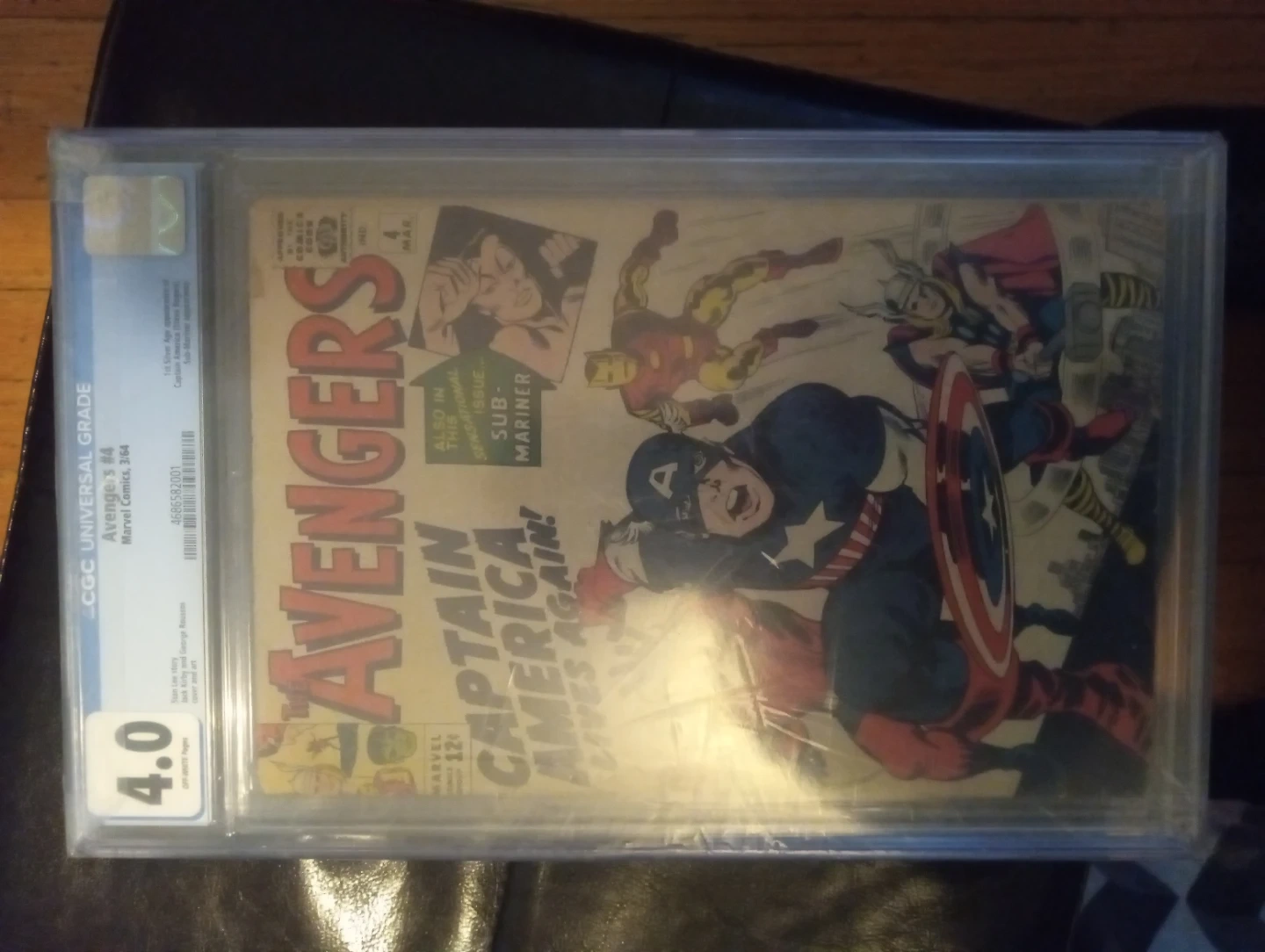 Avengers #4 comic book, graded 4.0 by CGC. Features Captain America, Iron Man, Thor, and Sub-Mariner. Story by Stan Lee with art by Jack Kirby. Published by Marvel Comics in March 1964. This is the first Silver Age appearance of Captain America.