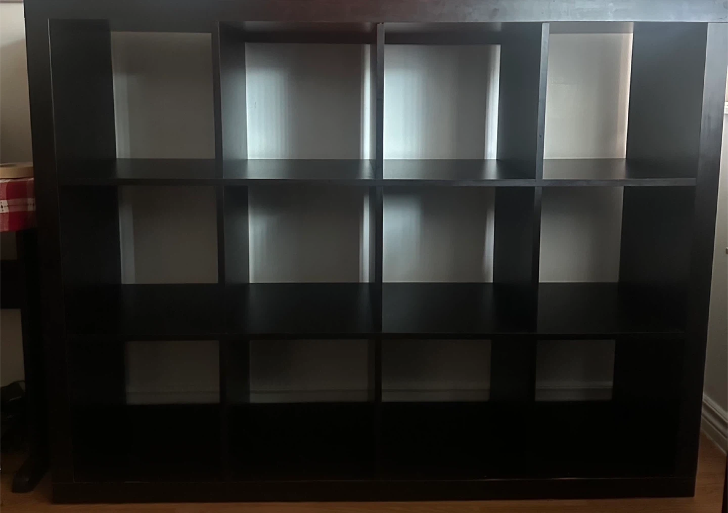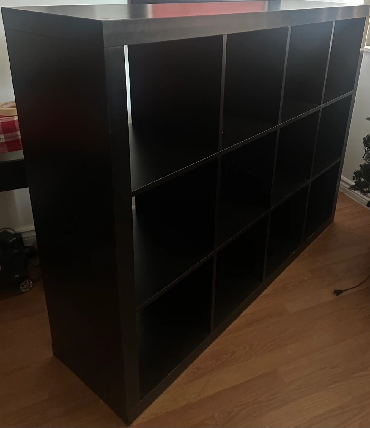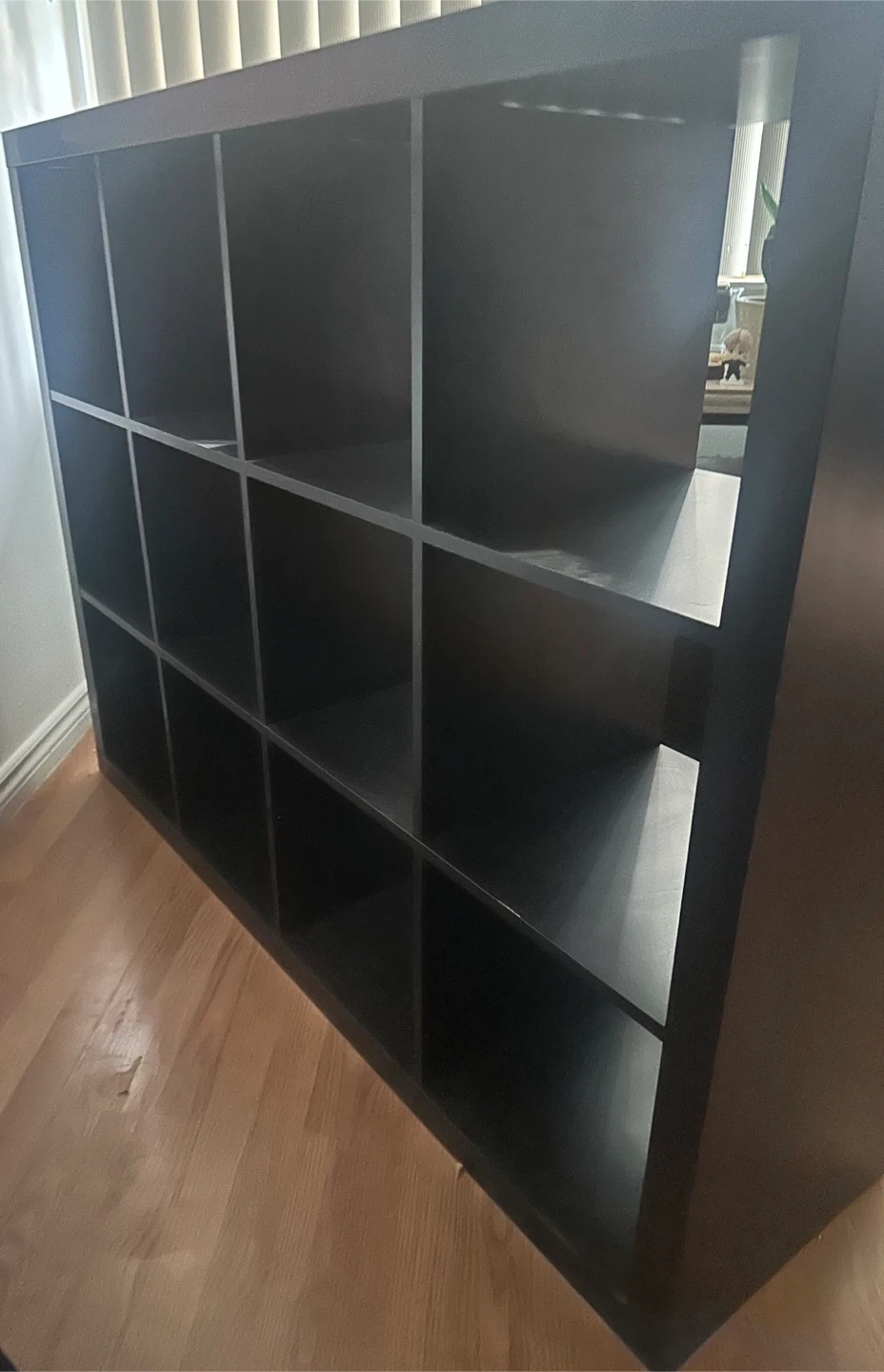Selling a black IKEA Kallax shelf unit. It has 4x4 compartments, perfect for storage or display. Great for organizing books, toys, or decor items. It's in good condition and ready for a new home!