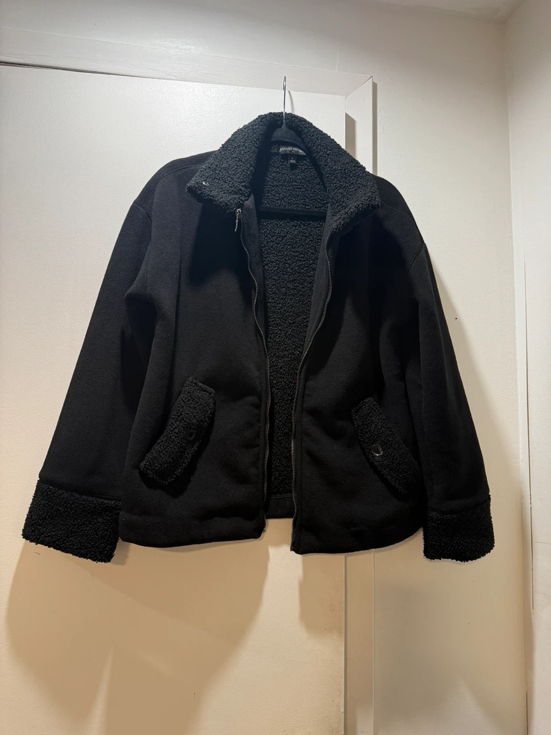 Selling a Banana Republic black fleece sherpa jacket in size small. It's in great condition and perfect for keeping warm. The sherpa lining adds extra coziness!