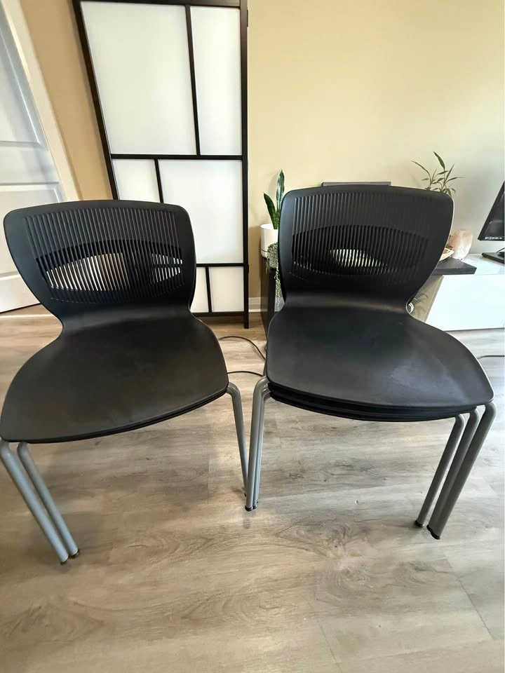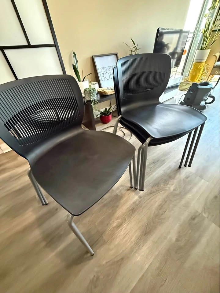 $150 for all 5 chairs…a solid price considering these chairs typically retail much higher. Perfect for any office, meeting space or even for dining. These chairs are slightly used but in good condition, ready to offer comfort and practicality. Featuring a sleek black design with a contoured seat and back for ergonomic support, they're as stylish as they are functional. Brand: Steelcase. Stackable design for easy storage. Durable construction for long-lasting use.