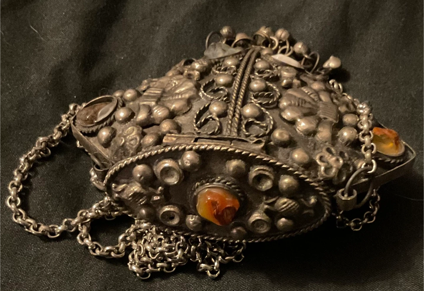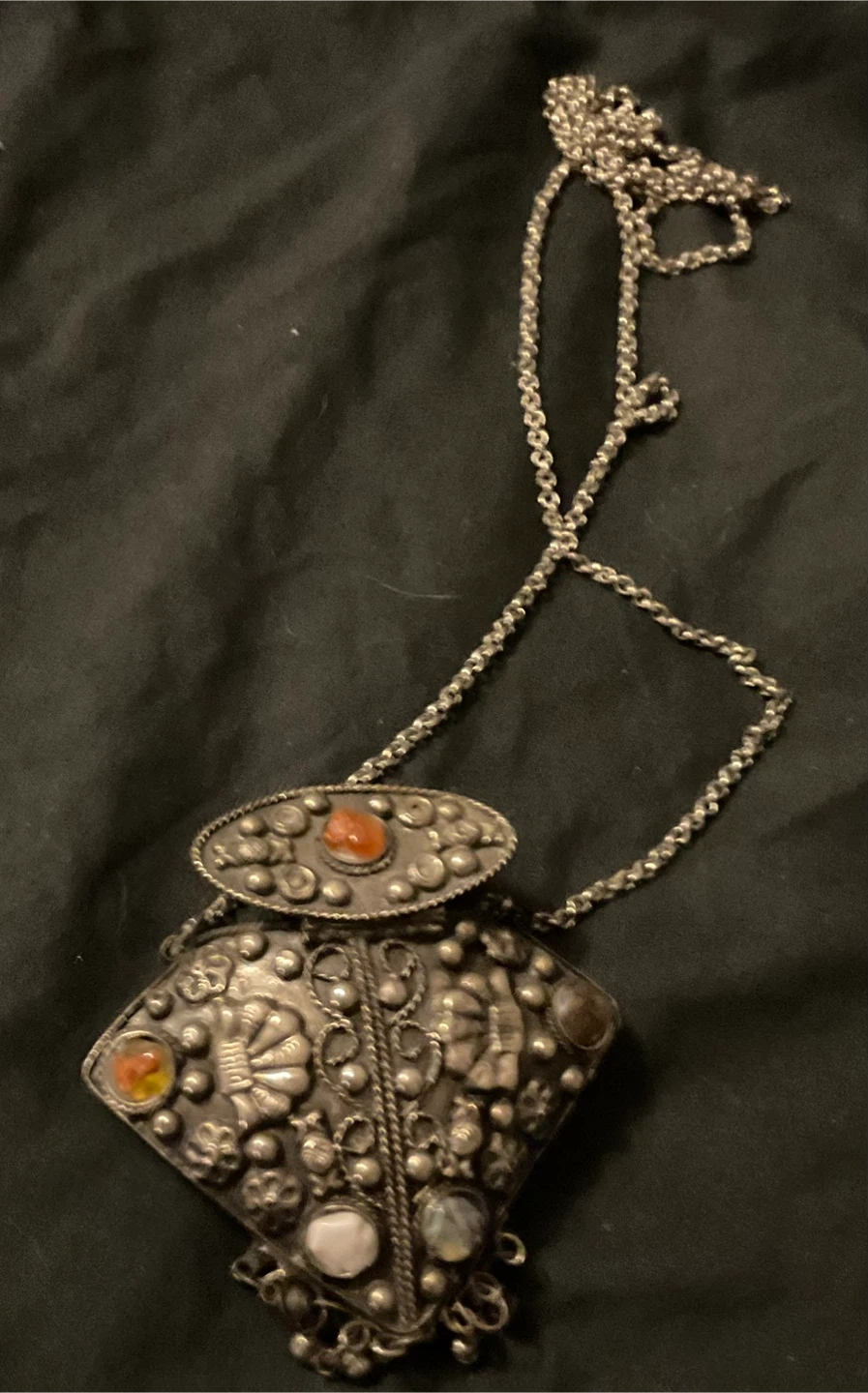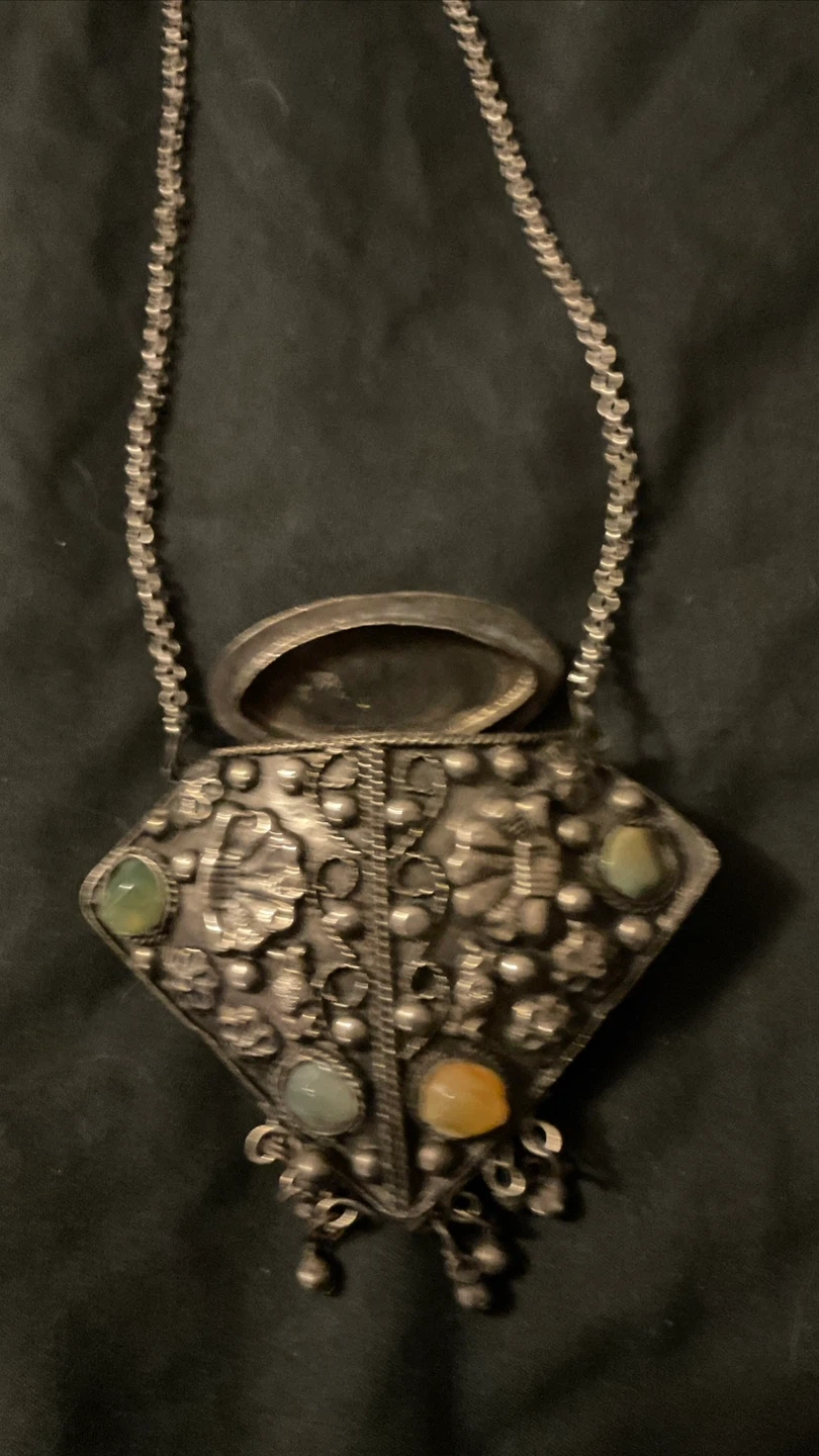 Gemstone Trinket Box Necklace silver tone pendant necklace. It features intricate detailing and colorful stone accents. A great statement piece!