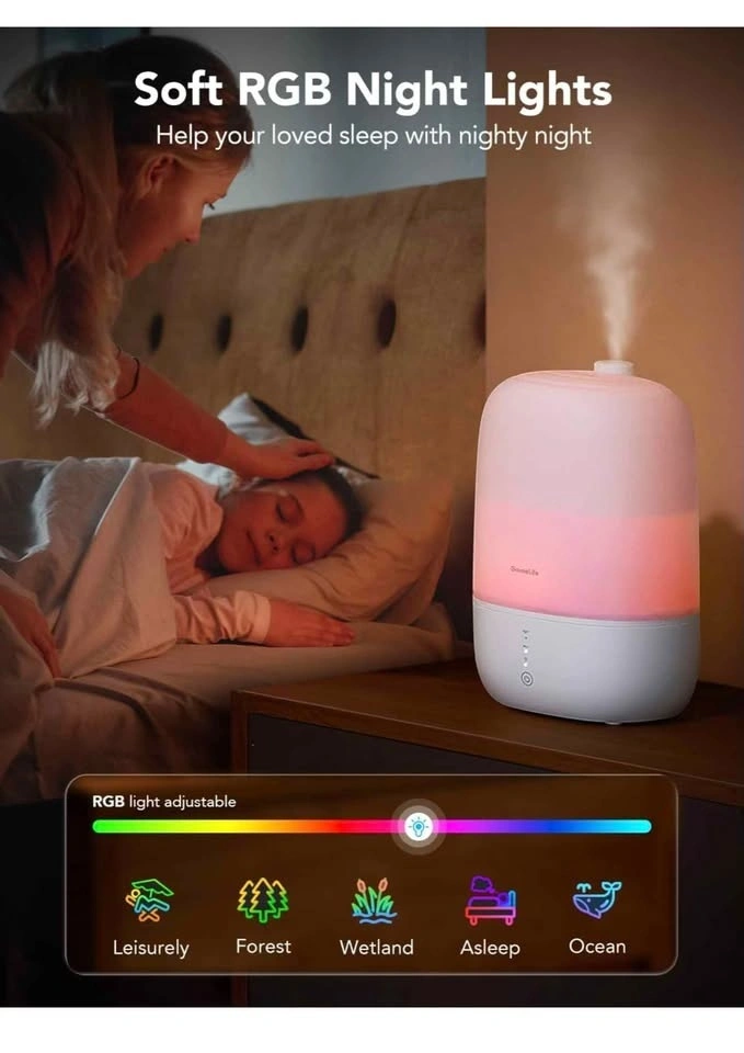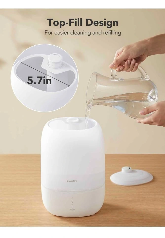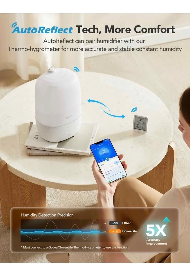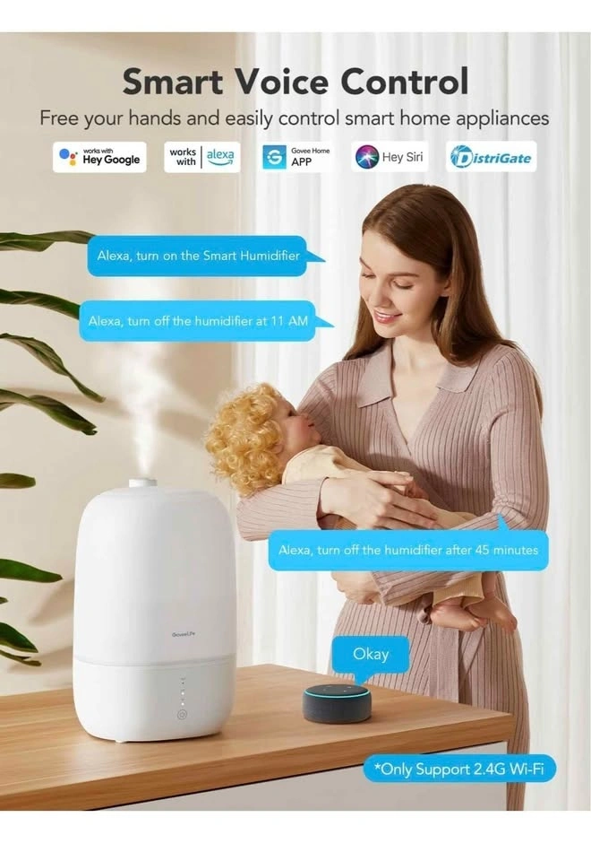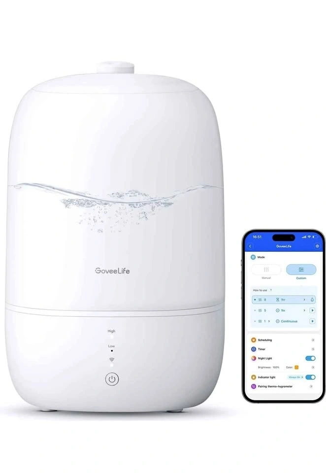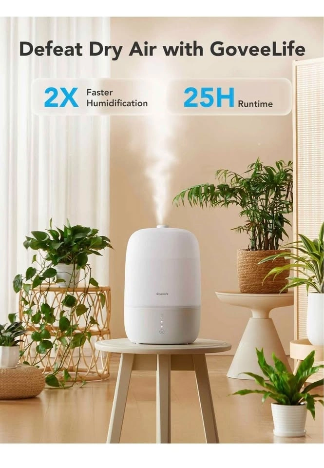 Smart GoveeLife humidifier with voice control for Alexa, Google, and Siri. Also controllable via the Govee Home app. Features a top-fill design for easy cleaning and refilling. Humidifies 2x faster with a 25-hour runtime. Great for beating dry air.