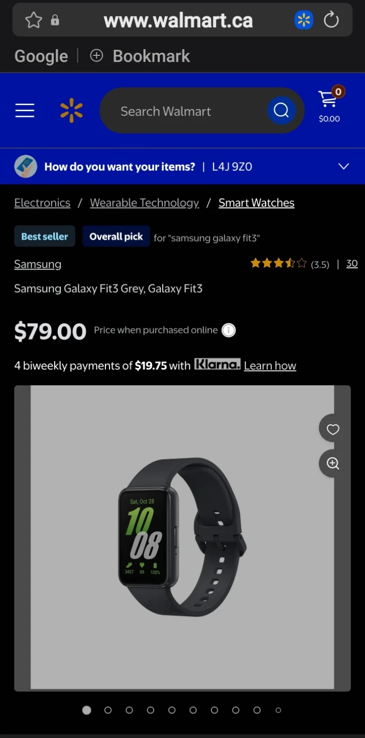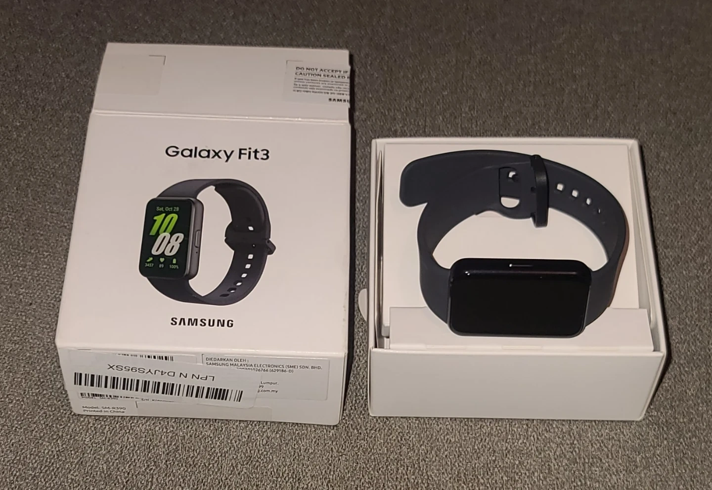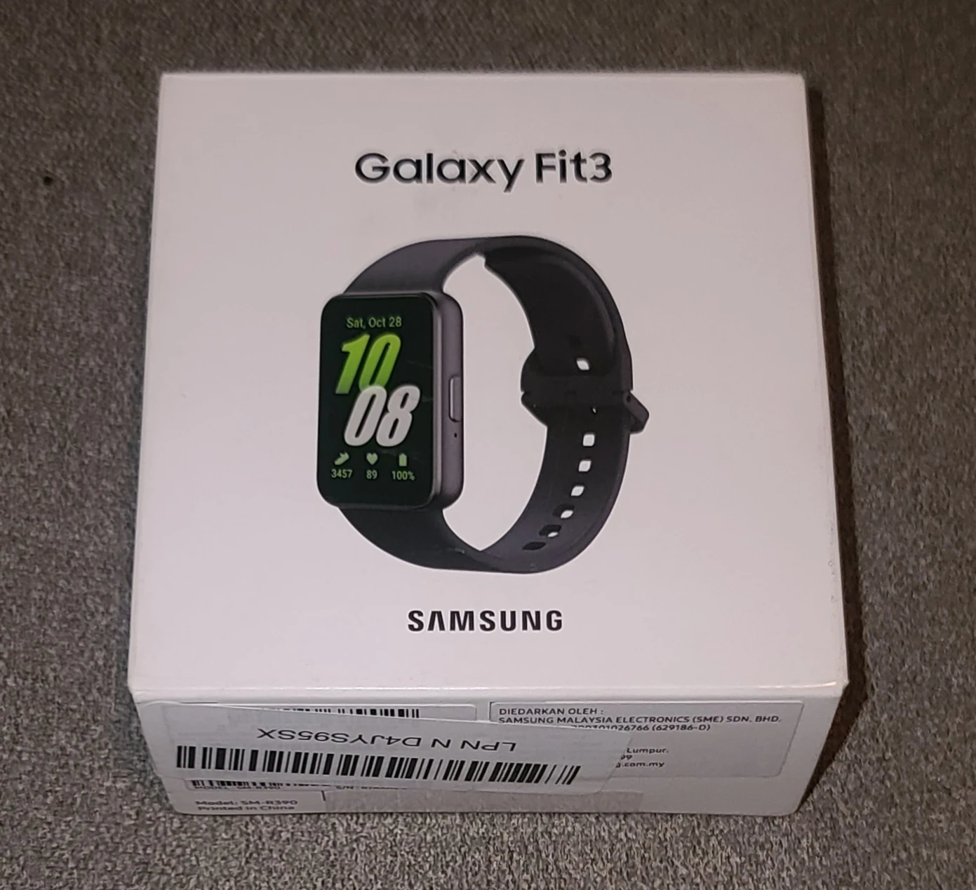 This is a Samsung Galaxy Fit3 smartwatch in grey. It comes with the original box and packaging. It's a great option for tracking your fitness and daily activity.