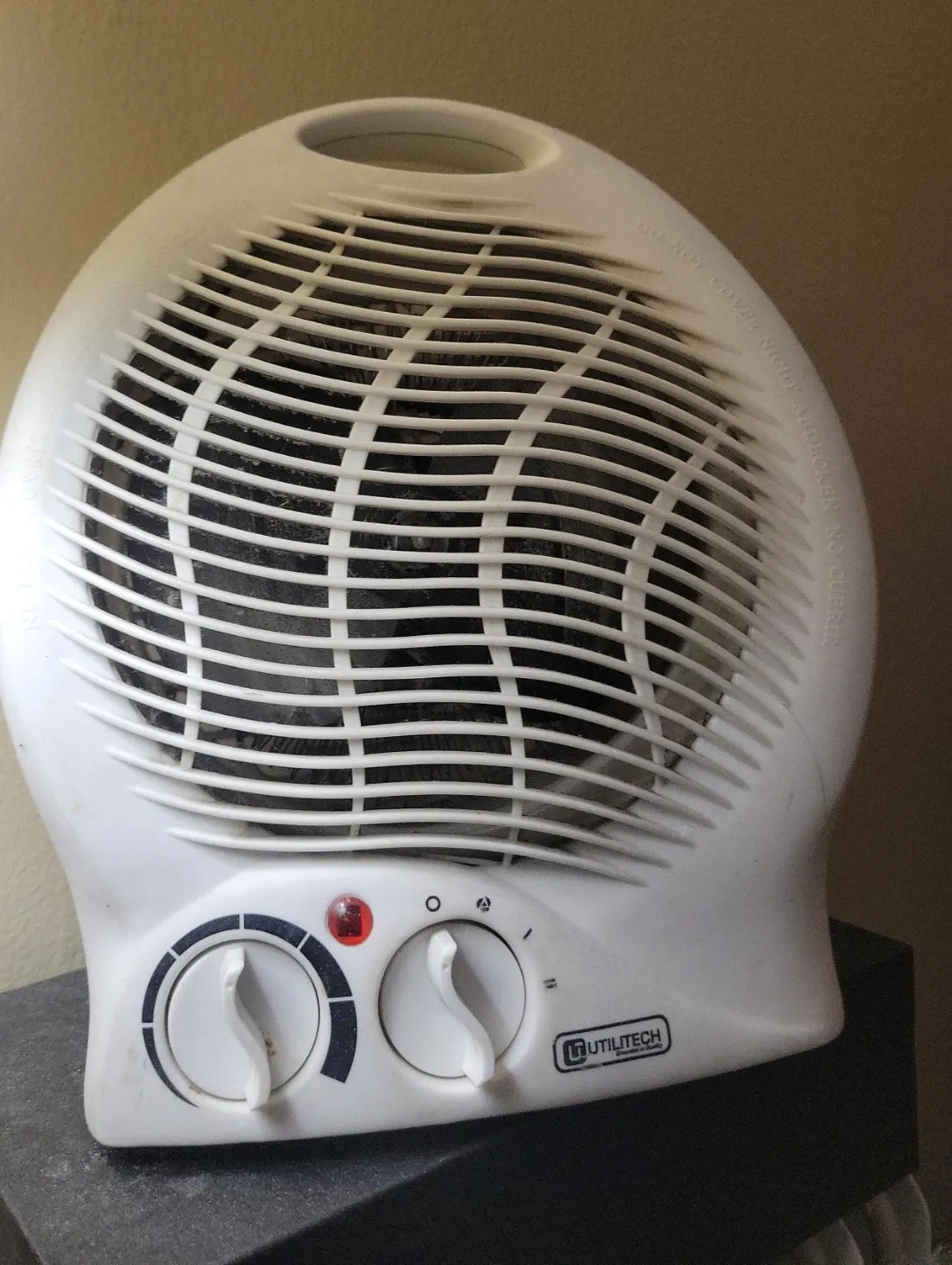 This portable electric fan heater is from Utilitech. It has two knobs for control and a power indicator light. It's white and made of plastic.
