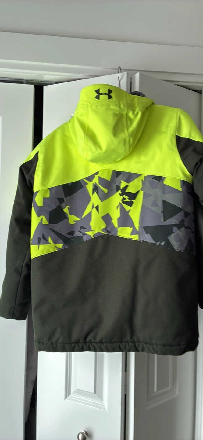 This Under Armour boys' winter jacket features a bright neon yellow hood and panels with a grey and neon geometric pattern. It's designed for cold weather. Great for outdoor activities when it's chilly!