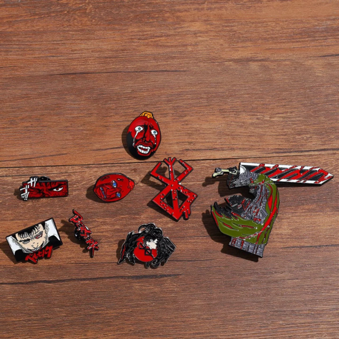 Set of 7 Berserk-themed enamel pins. Features iconic characters and symbols from the anime. These pins are made of durable metal.