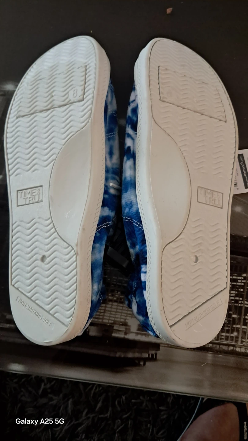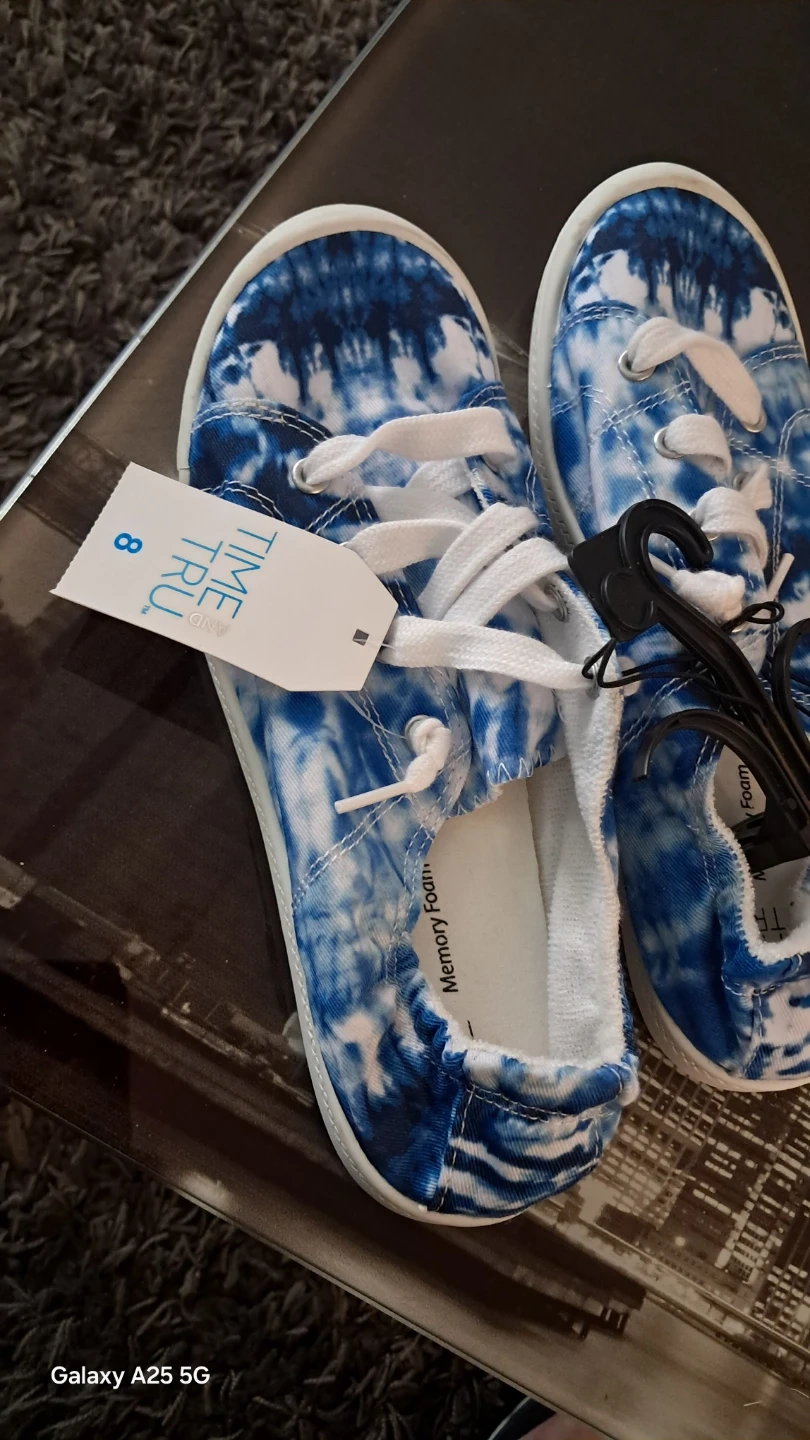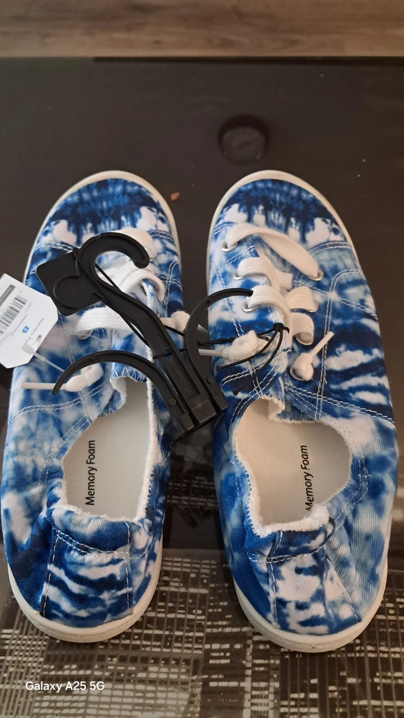 These are casual sneakers with a blue tie-dye pattern. They feature memory foam insoles for comfort. Size 8 women's casual. Delivery also available a bit charges depend on distance reason I am moving to home country