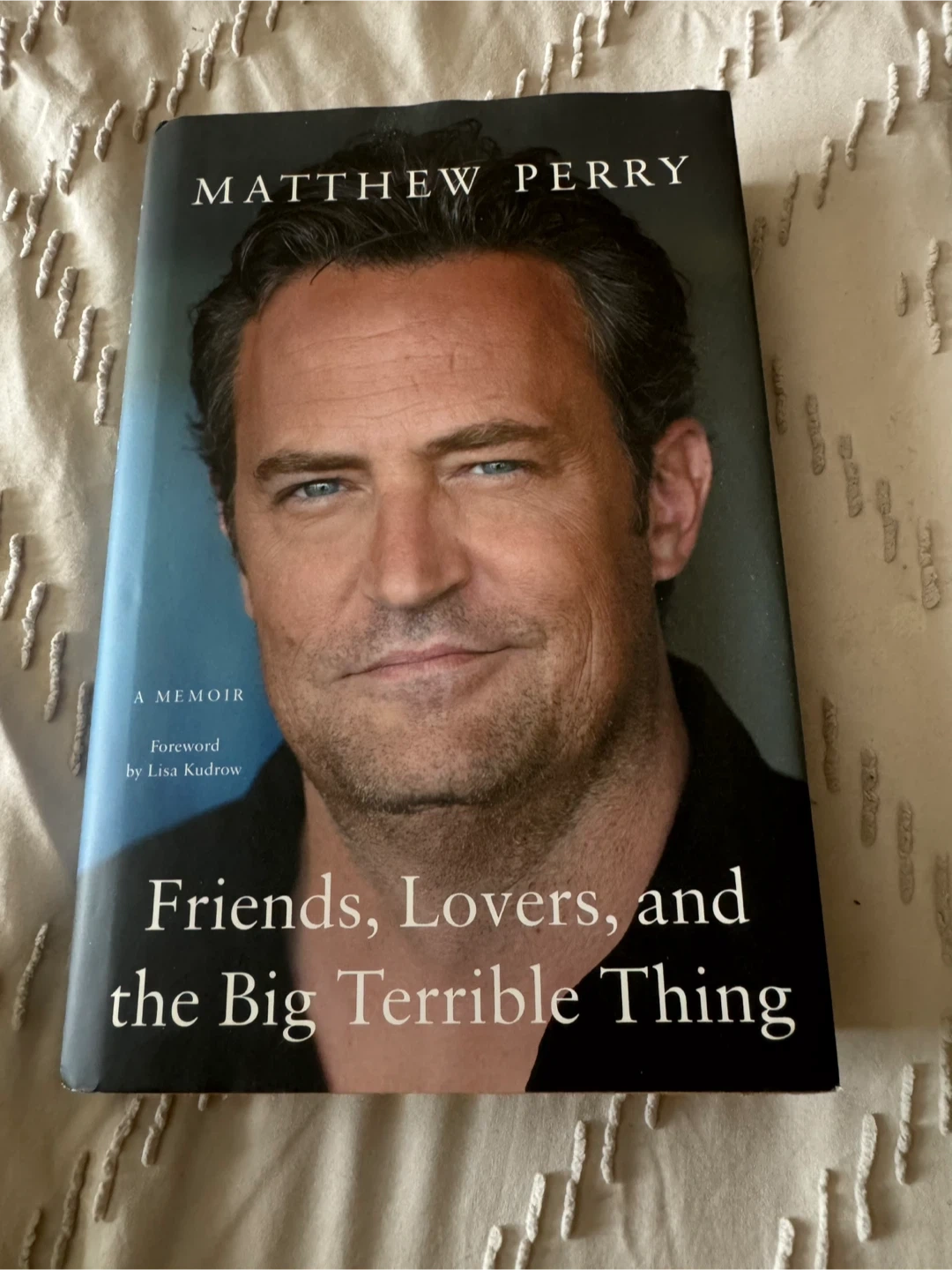 This is Matthew Perry's memoir, 'Friends, Lovers, and the Big Terrible Thing.' It was written by Matthew Perry and includes a foreword by Lisa Kudrow. This book is a raw and unflinching look into his life.