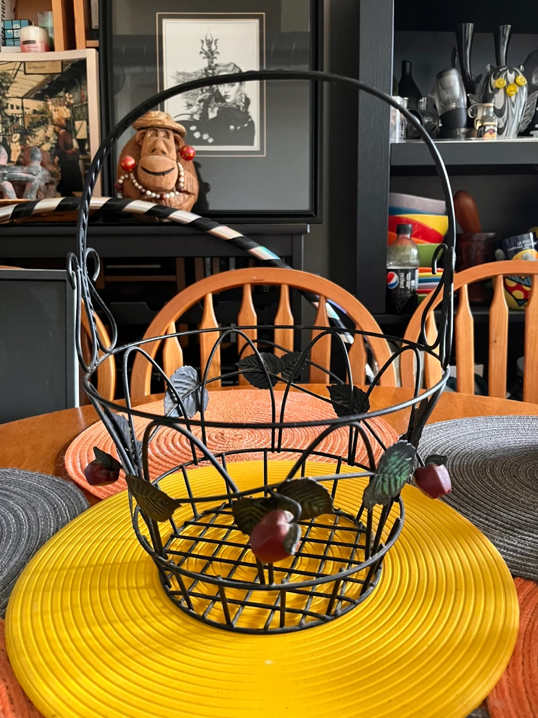 This wire basket features a decorative design with apple accents. It's suitable for holding fruit or as a planter holder. The sturdy handle makes it easy to carry.