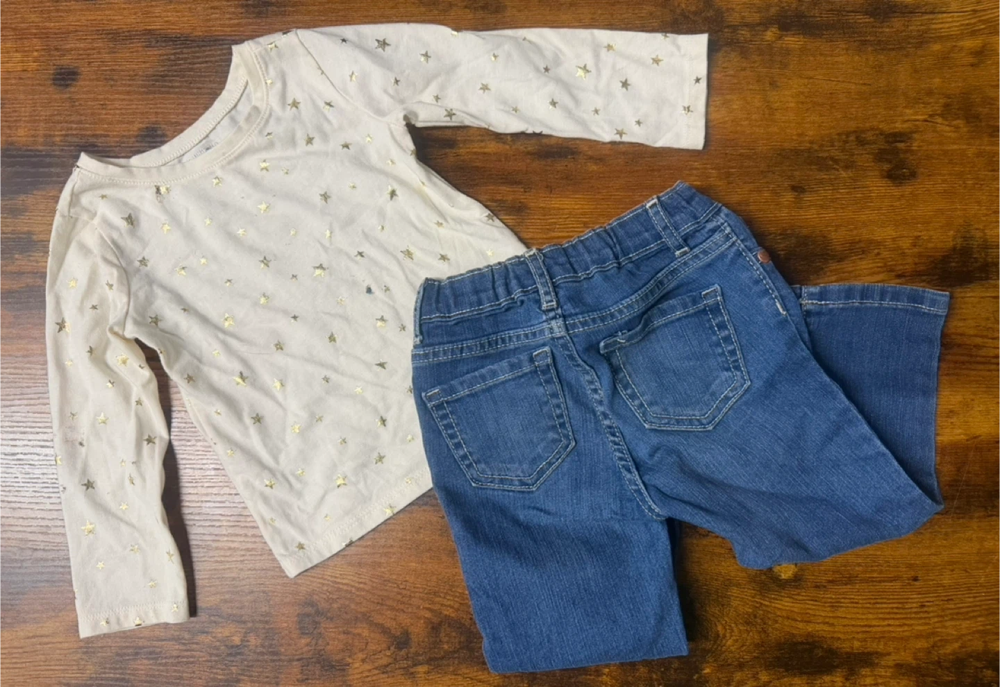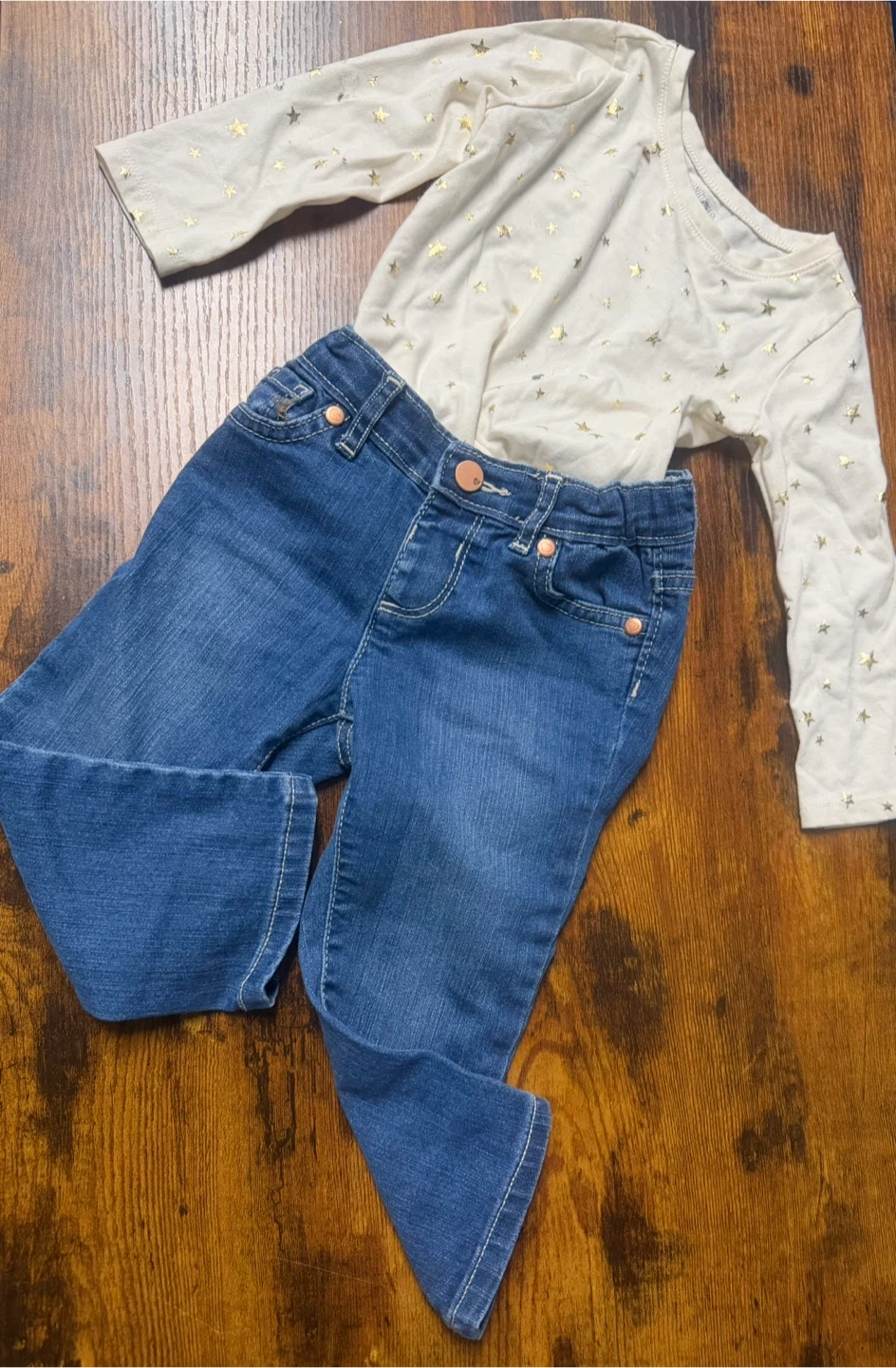 Cream colored long sleeve shirt with gold star print. Blue denim jeans with copper button details. These are child-sized items.