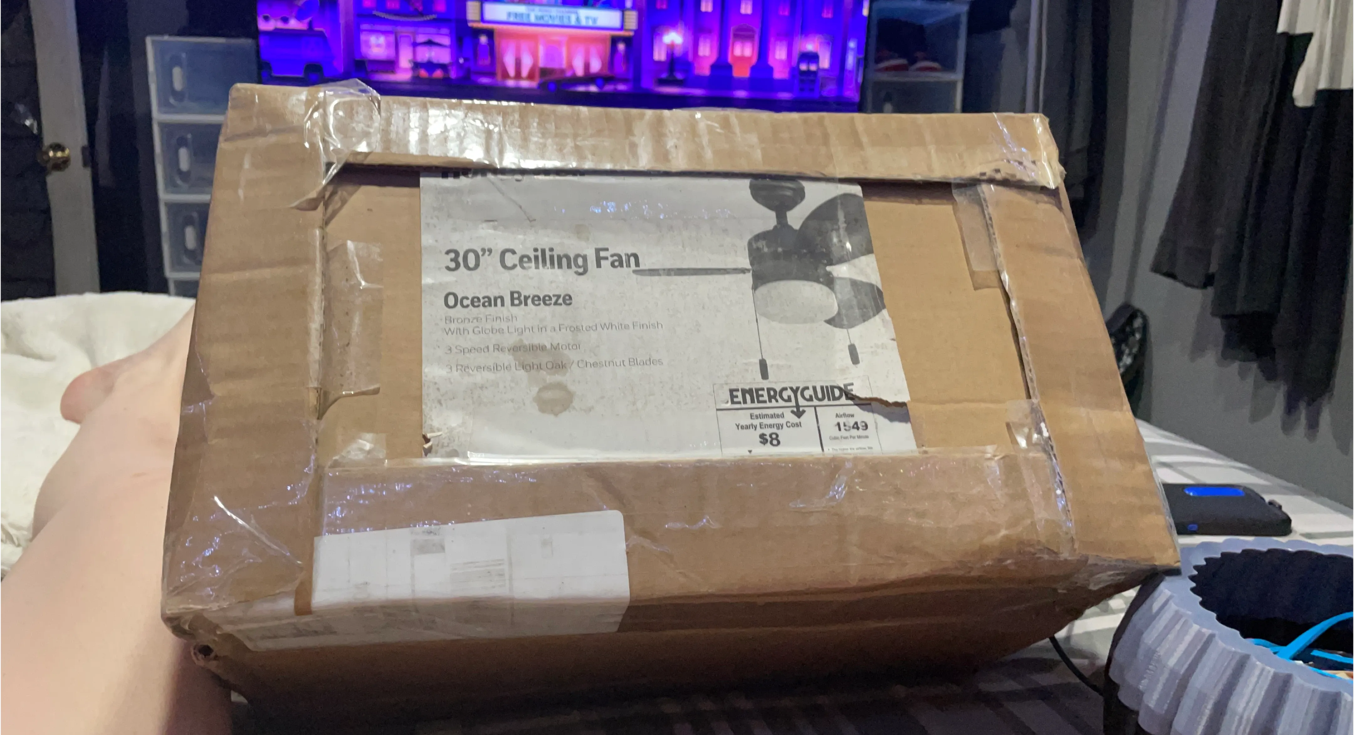 This is a 30" Ocean Breeze ceiling fan. It has a bronze finish and includes a globe light with a frosted white finish. The fan features a 3-speed reversible motor and reversible light oak/chestnut blades. Includes original box. It's useful for circulating air and providing light in a room.