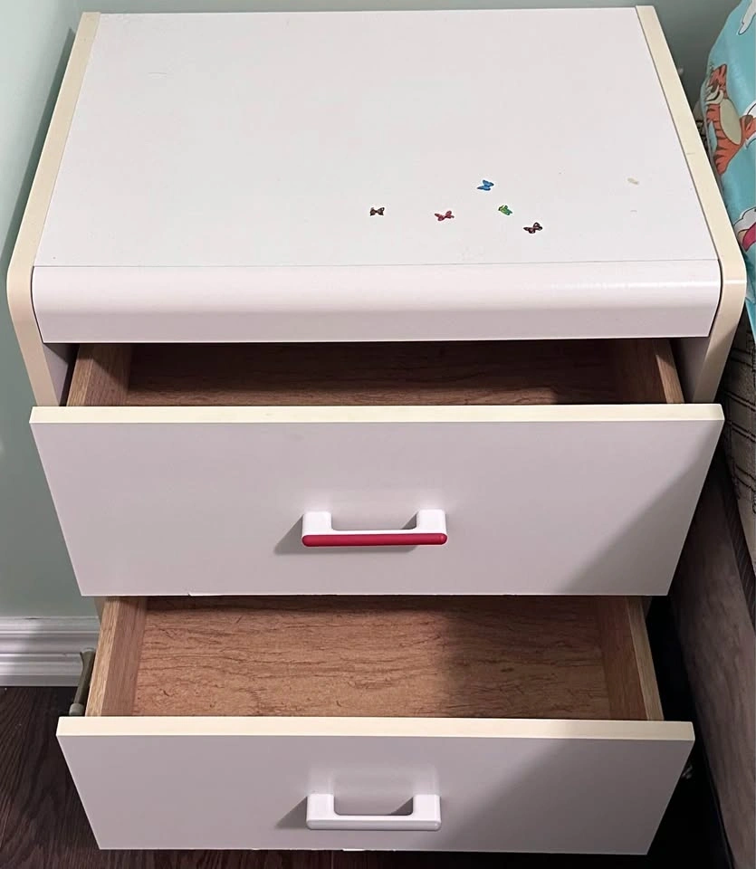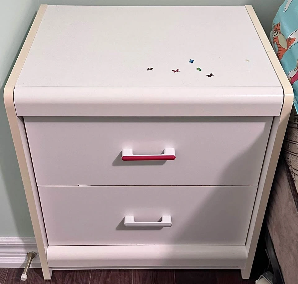 Selling a white 2-drawer nightstand. Simple, clean design—great for kids bedroom. Has a few stickers on the top that can be removed easily with Goo Gone. Overall fair functional condition with some cosmetic wear (see photos), priced accordingly. Two drawers for storage. Move-out sale – must go. Asking $10. Pickup only.