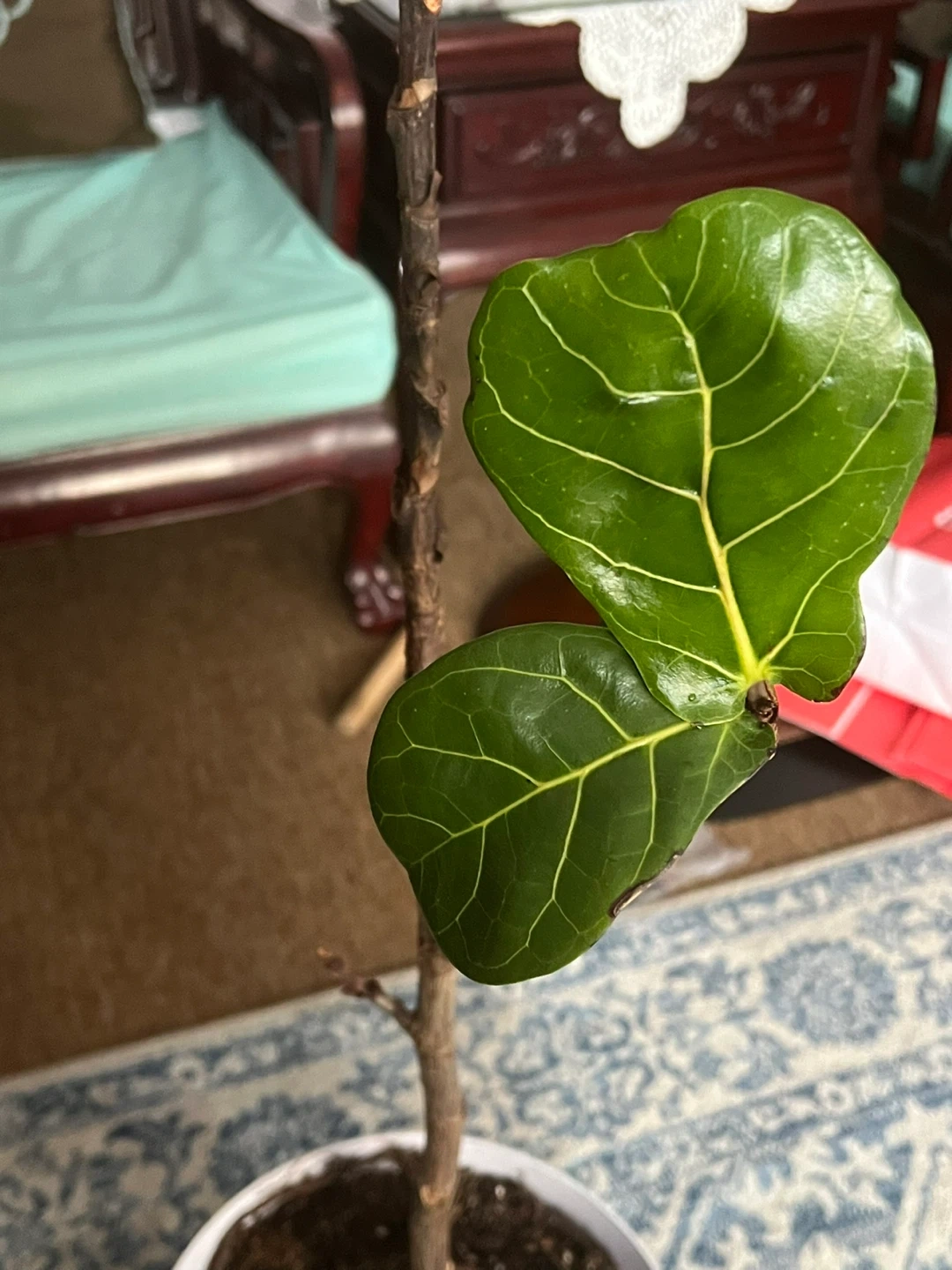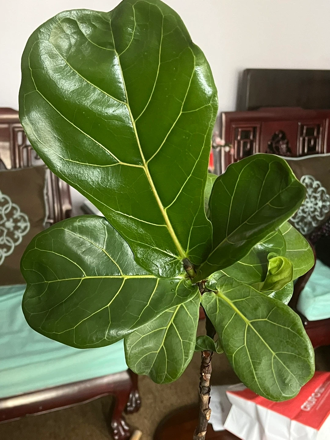 Healthy fiddle leaf fig plant with large, glossy leaves. This plant thrives in bright, indirect light. It's a great addition to any home or office decor!