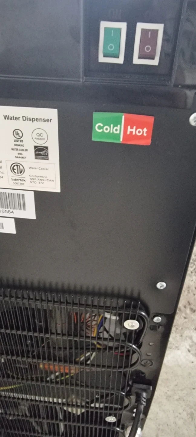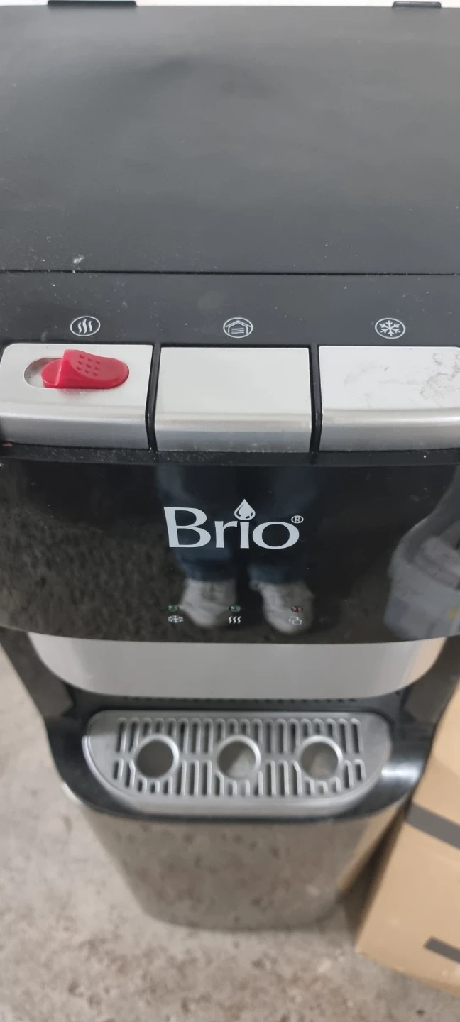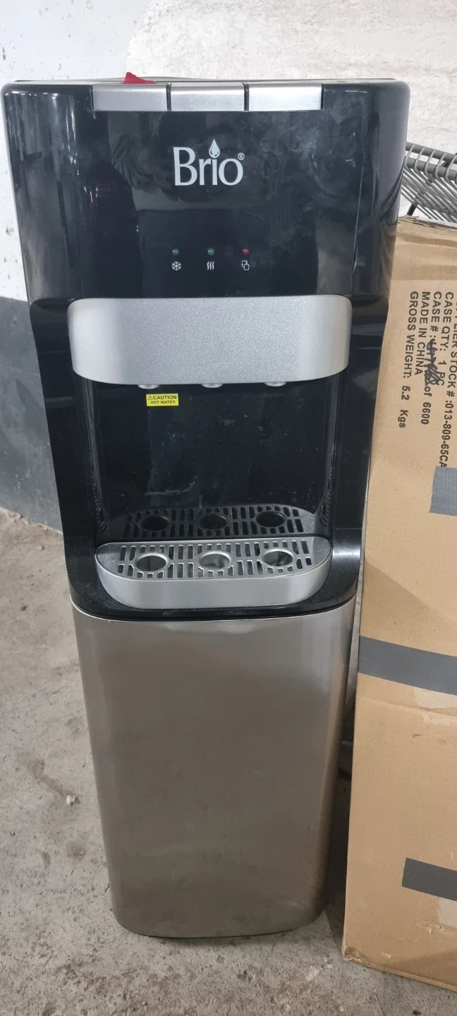 This is a Brio brand water dispenser with both hot and cold water options. It features easy-to-use buttons for dispensing water. Perfect for any home or office looking for convenient access to chilled or heated water.