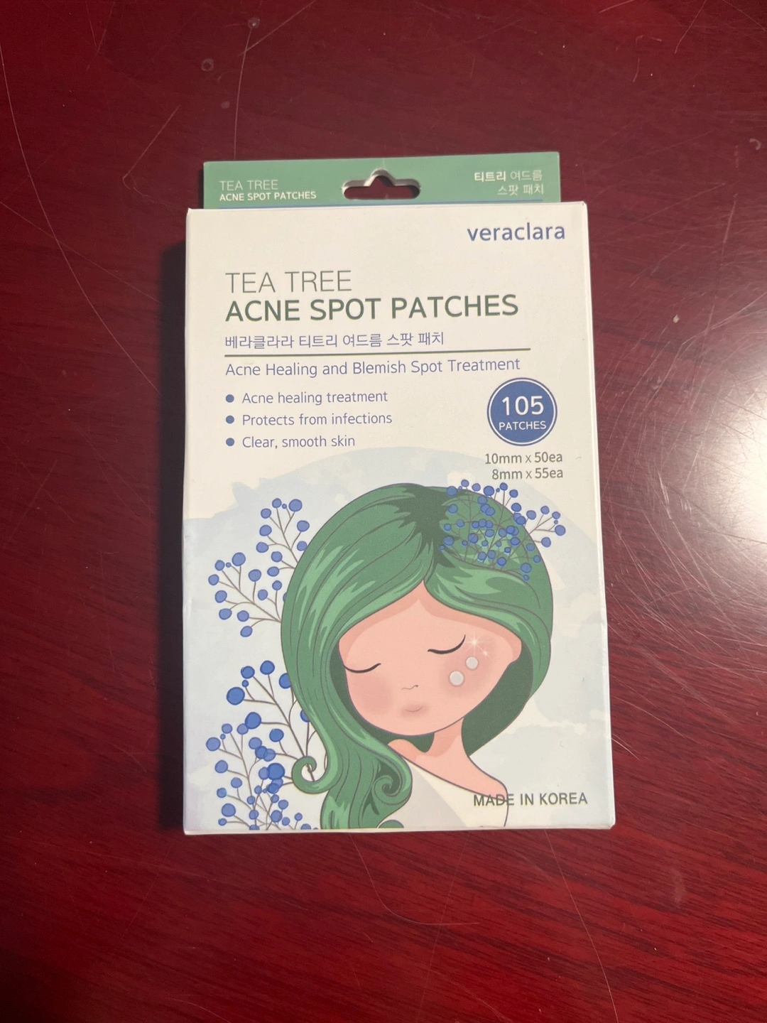 I'm selling a box of Veraclara Tea Tree Acne Spot Patches! This box contains 105 patches, including 50 patches that are 10mm and 55 patches that are 8mm. These patches are designed for acne healing and blemish spot treatment, helping to protect from infections and promote clear, smooth skin