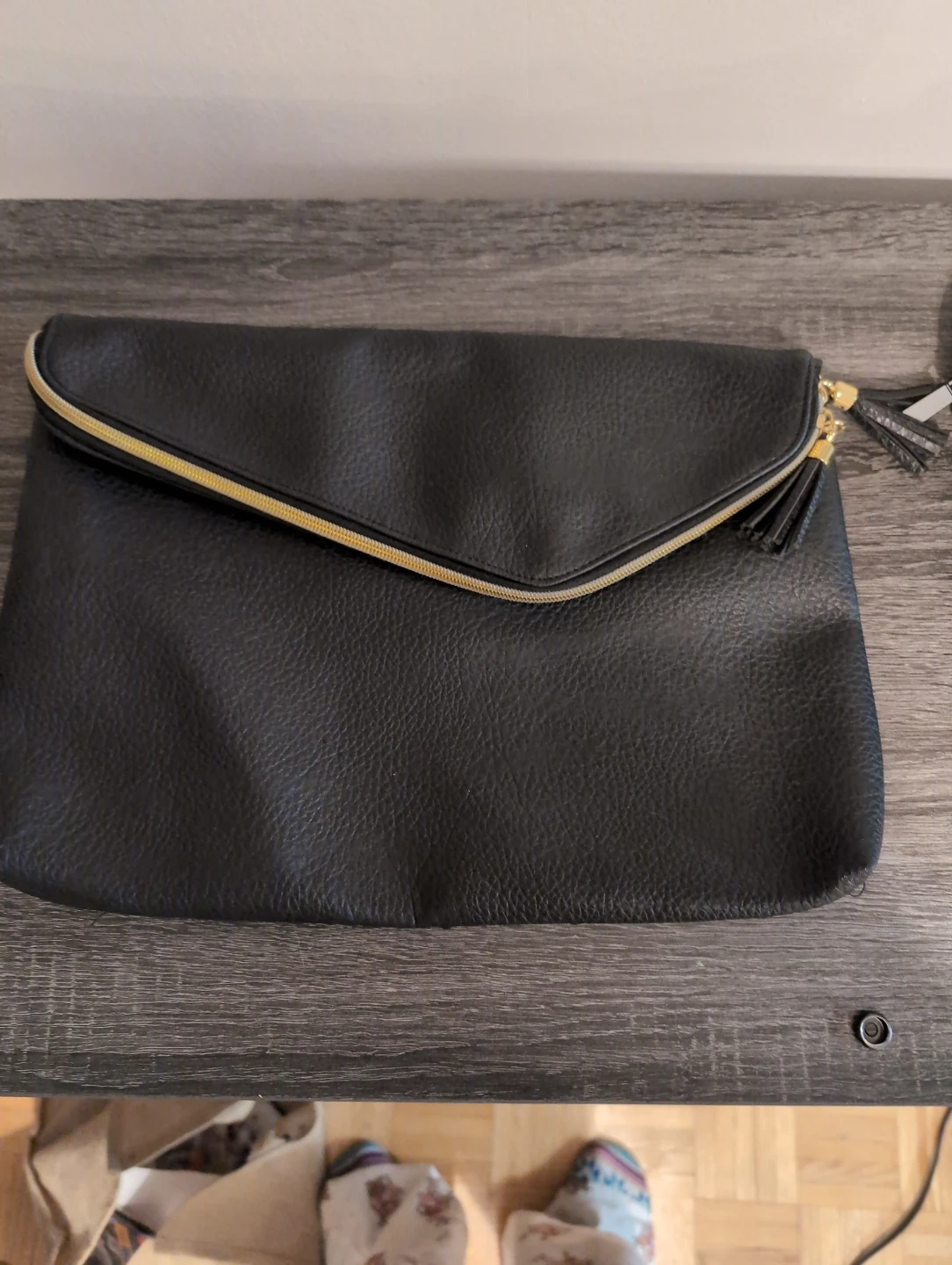 This black fold-over clutch bag features a faux leather texture and gold-tone hardware. It includes a zippered closure and decorative tassels. The leather has been cleaned, treated, moisturized and sealed. It's a great find!