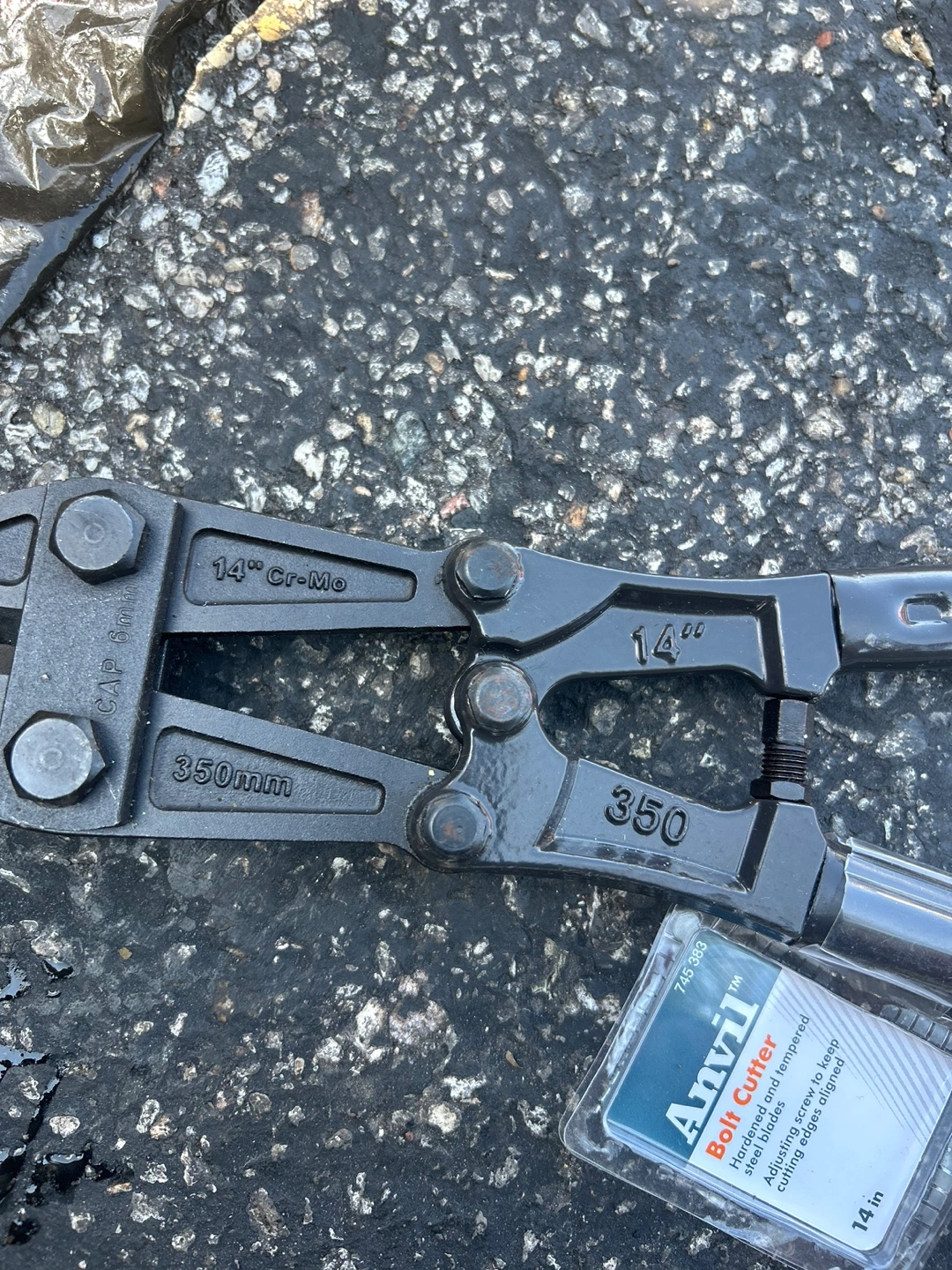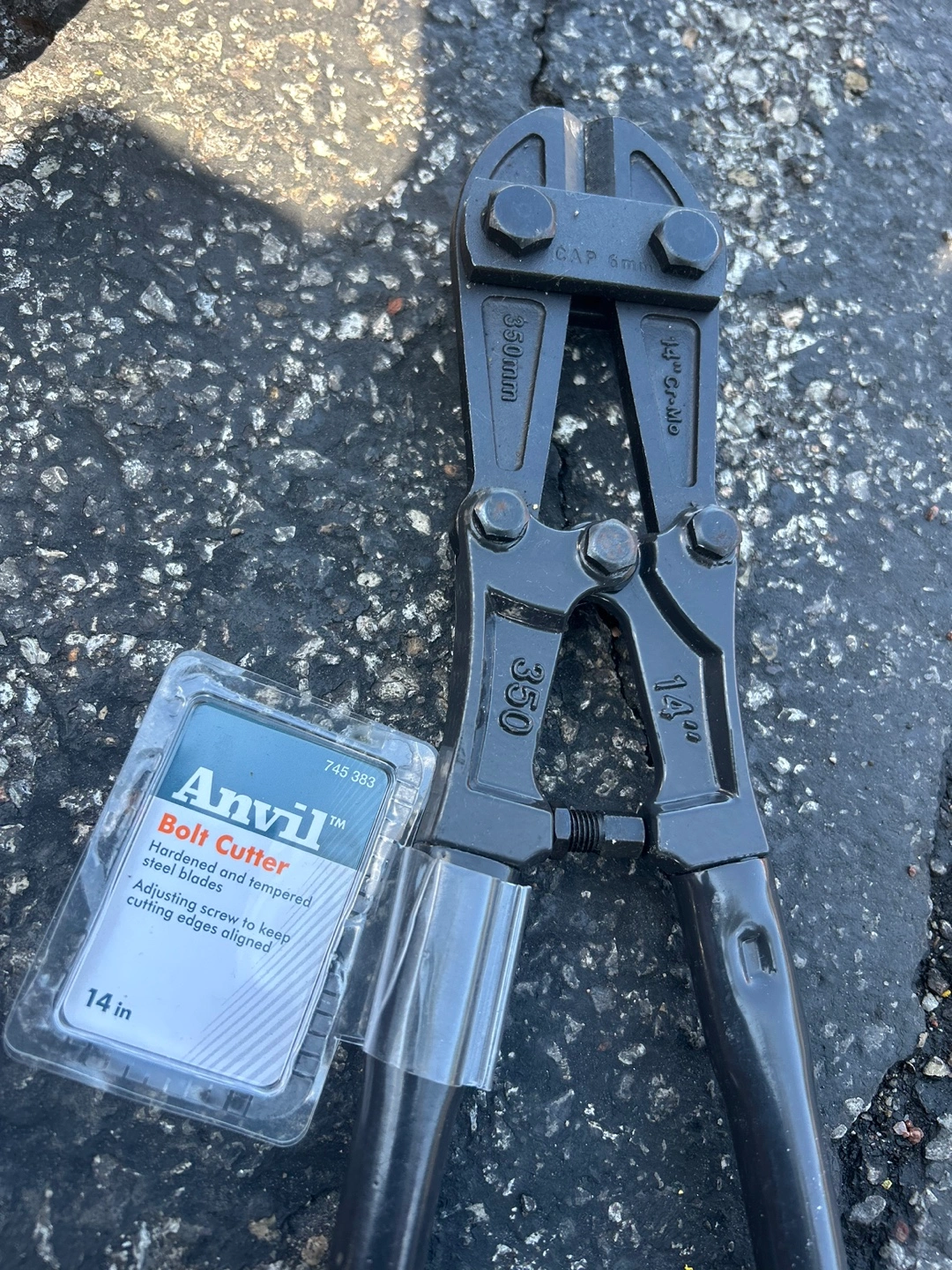 I'm selling a brand new Anvil 14-inch bolt cutter, still sealed in its original packaging! The blades are hardened and tempered steel, and there's an adjusting screw to keep the cutting edges aligned