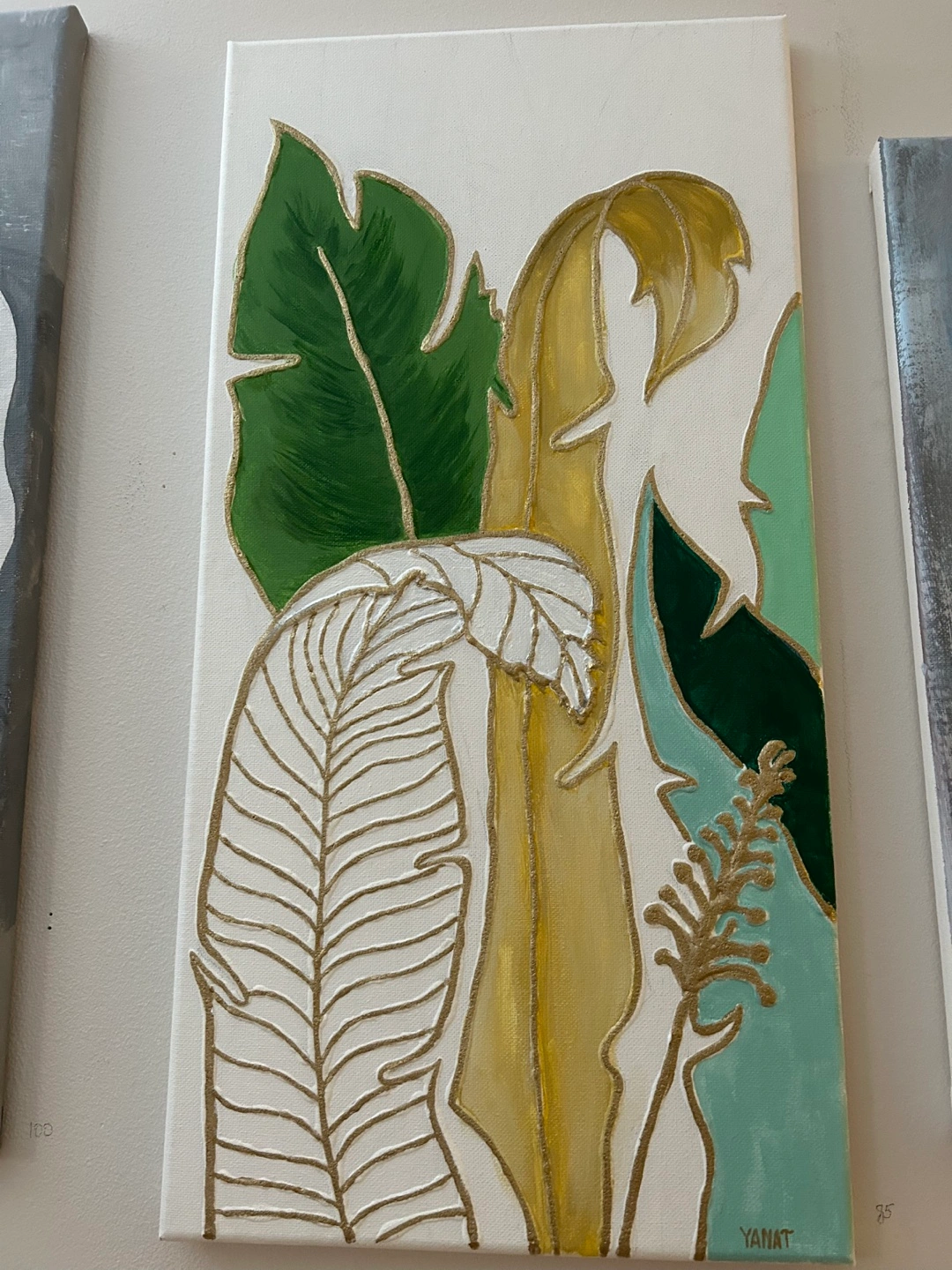 Handmade painting on Canvas. Depicts stylized foliage in various colours. Outlined with gold-toned paint. A great addition to a tranquil space.