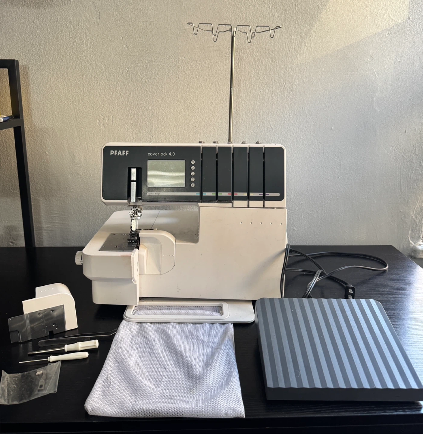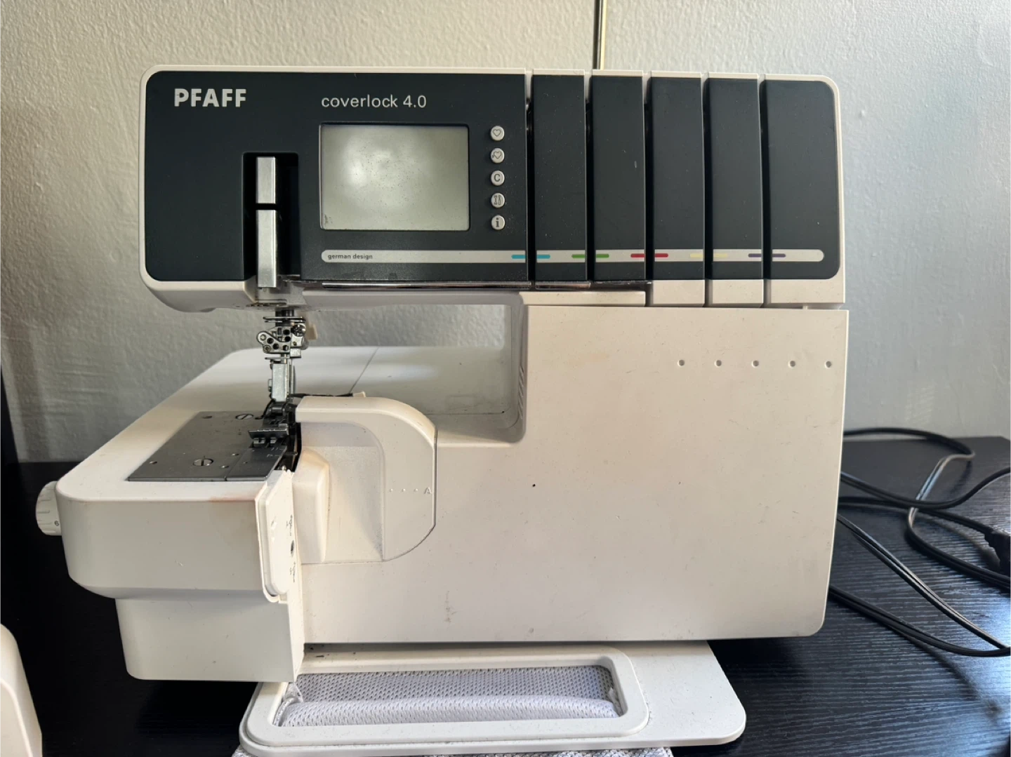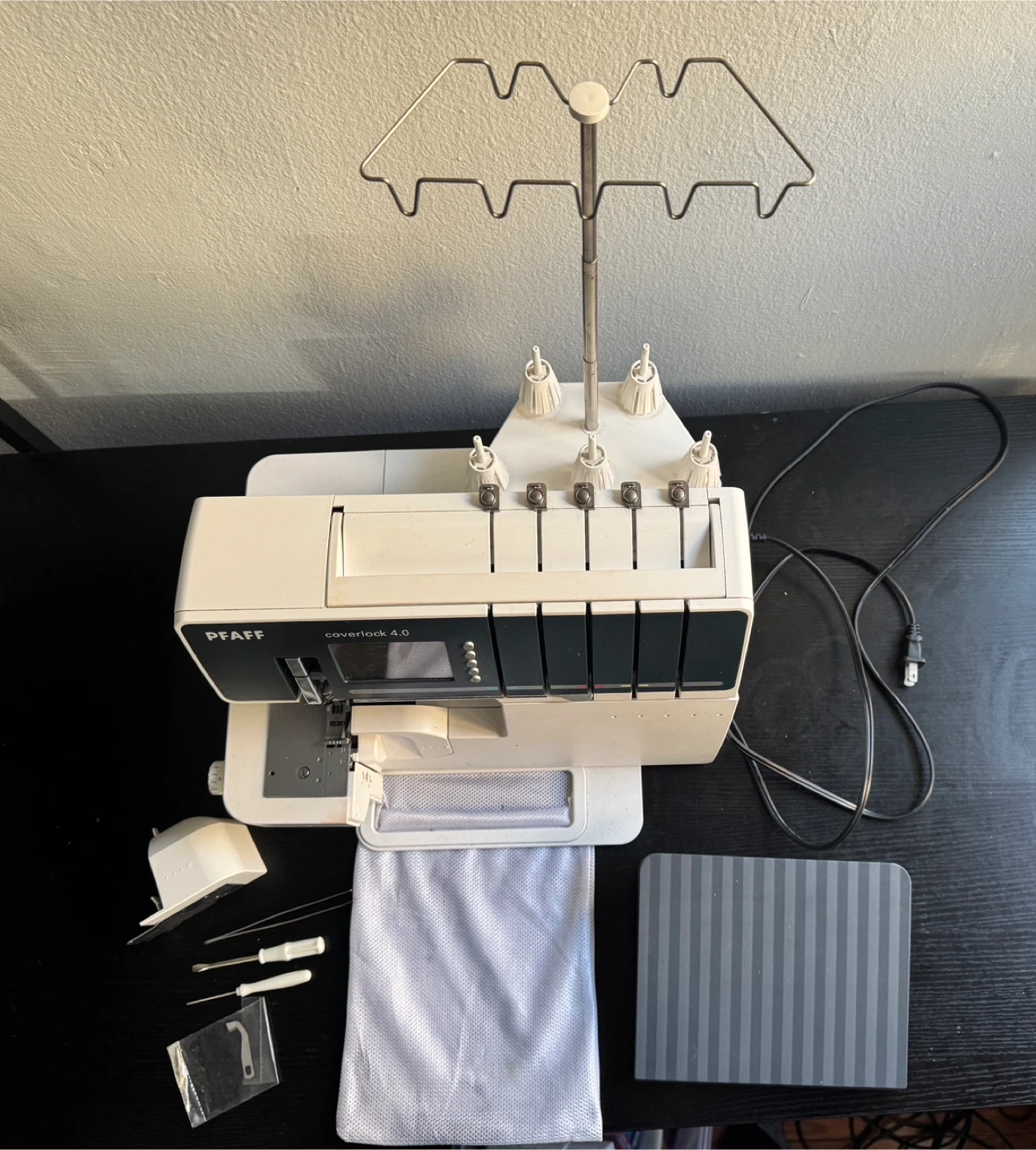 This is a Pfaff 4.0 serger and cover-stitch machine. Comes with accessories, power cord, and foot pedal with retractable cord. In good condition. Does not come with a hardcopy manual, but there is one available online.