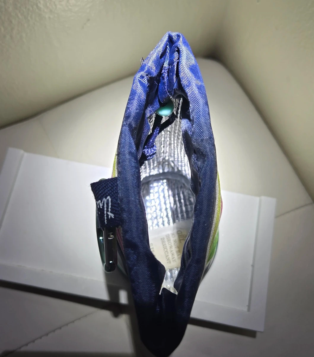 This is a Thirty-One Gifts thermal sinch top pouch. It features a colorful striped design and a convenient string closure to keep your items secure. Perfect for keeping snacks or drinks cool on the go