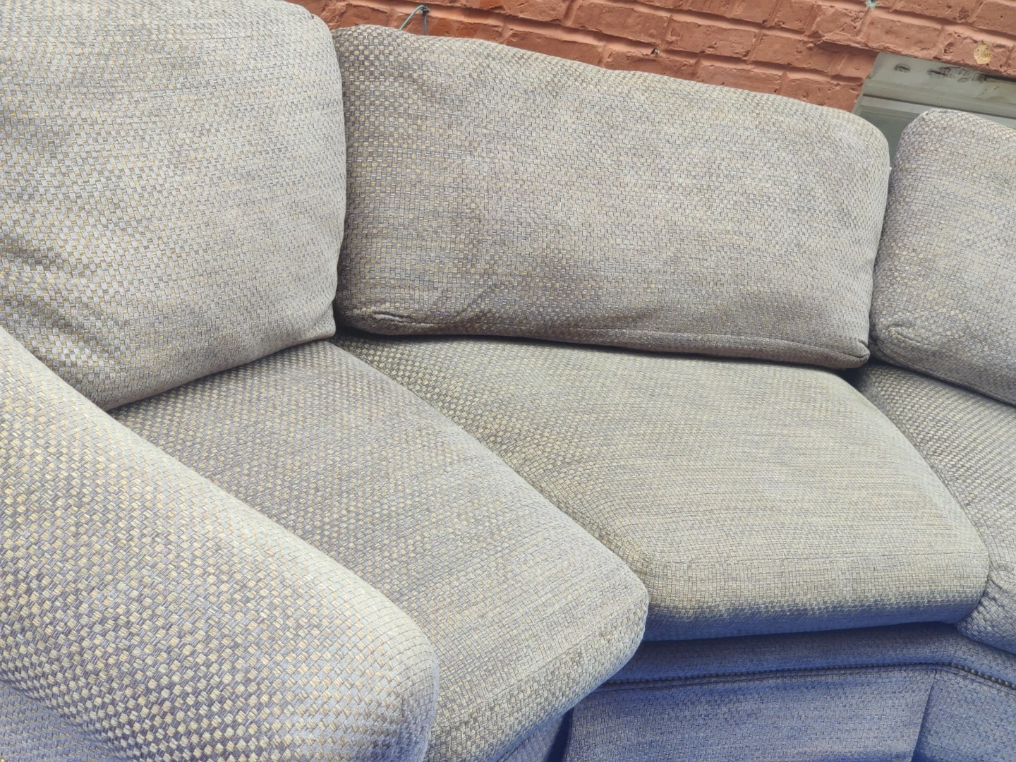 Brown upholstered sofa with loose back cushions. It's a comfortable three-seater with plush seating. Fabric material is a textured weave.