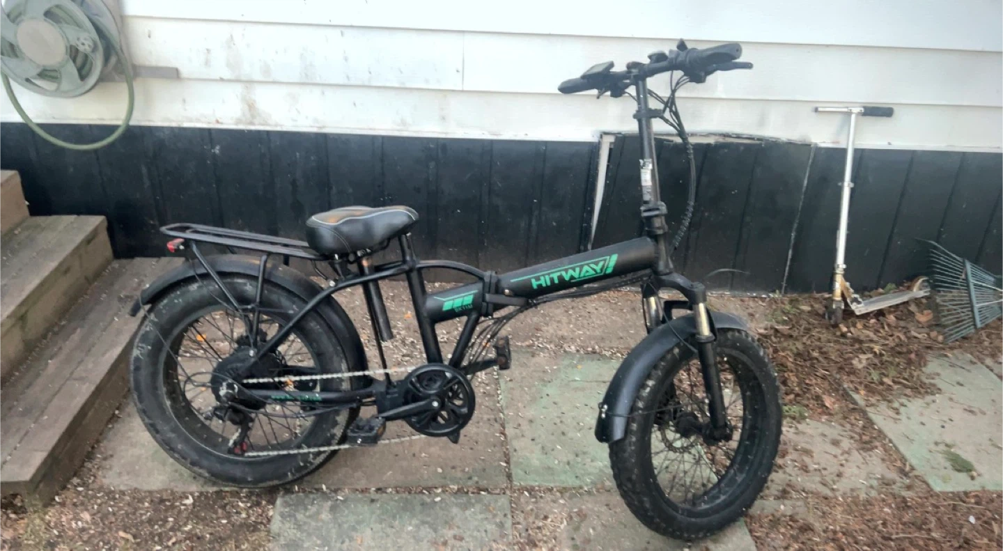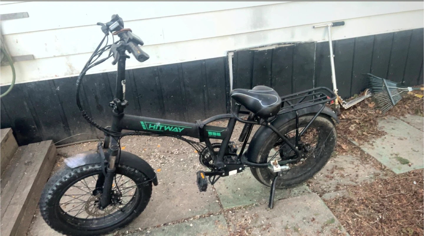 This is a HITWAY BK11M folding electric fat bike. It's black with fat tires and a rear rack. Features a digital display and headlight. The battery is missing from keeping it in storage it’s rusting in areas but it’s not to major it can be cleaned off but the bike has no issues peddling, and the back break works great just the shifter needs to be tightened. Other things need some tightening as-well and the bike needs a battery replacement.