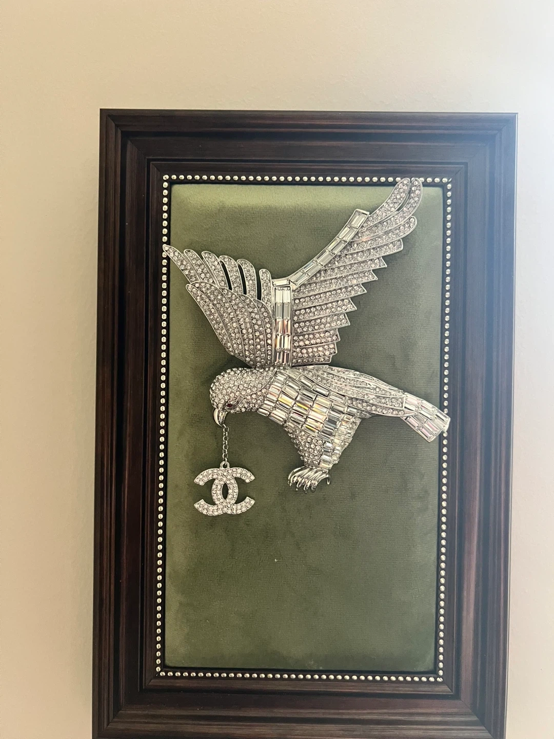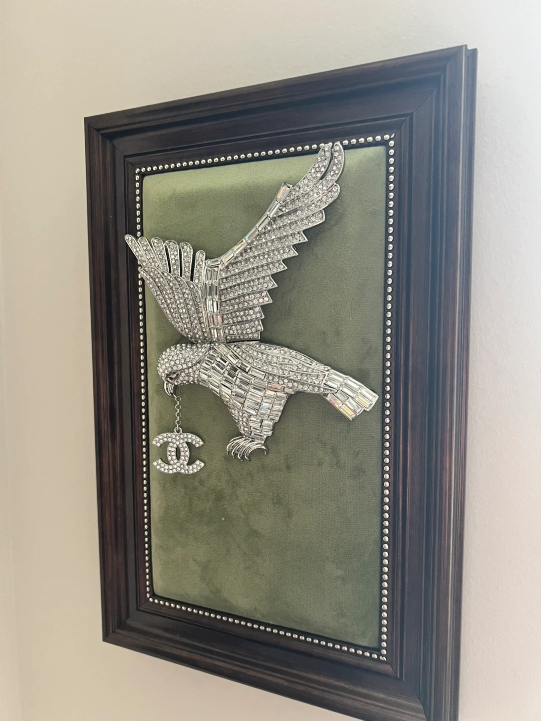 This statement piece features a crystal-encrusted eagle design with a dangling Chanel logo. It's framed in dark wood with a velvet-like backing. Perfect for adding a touch of glam to any room!