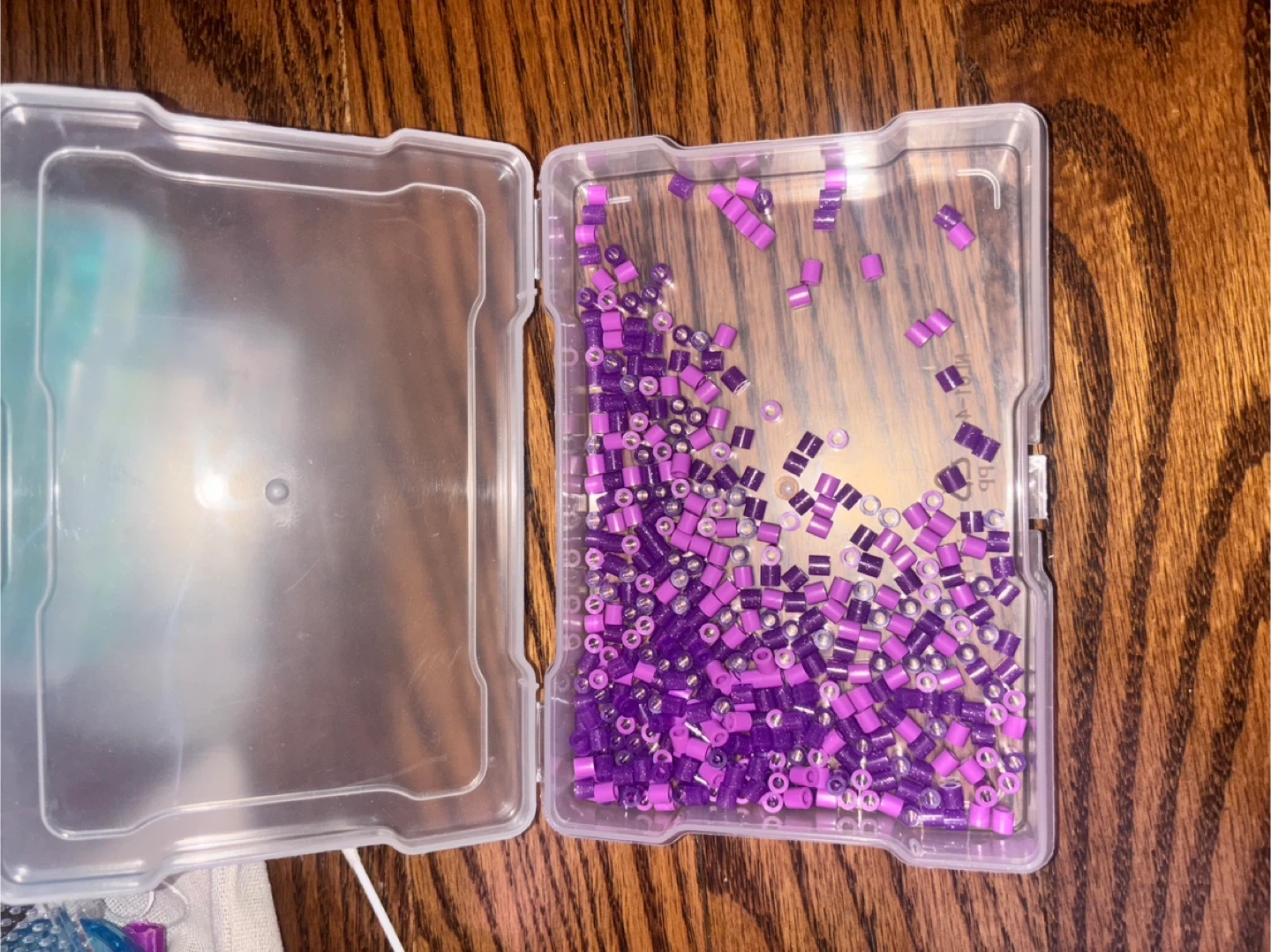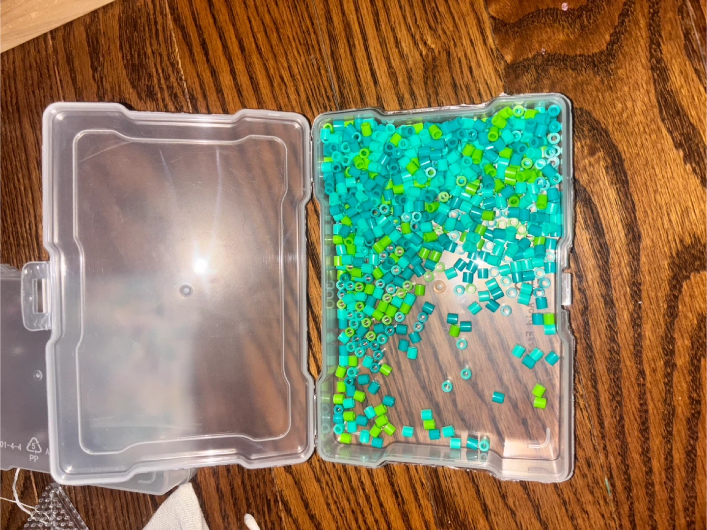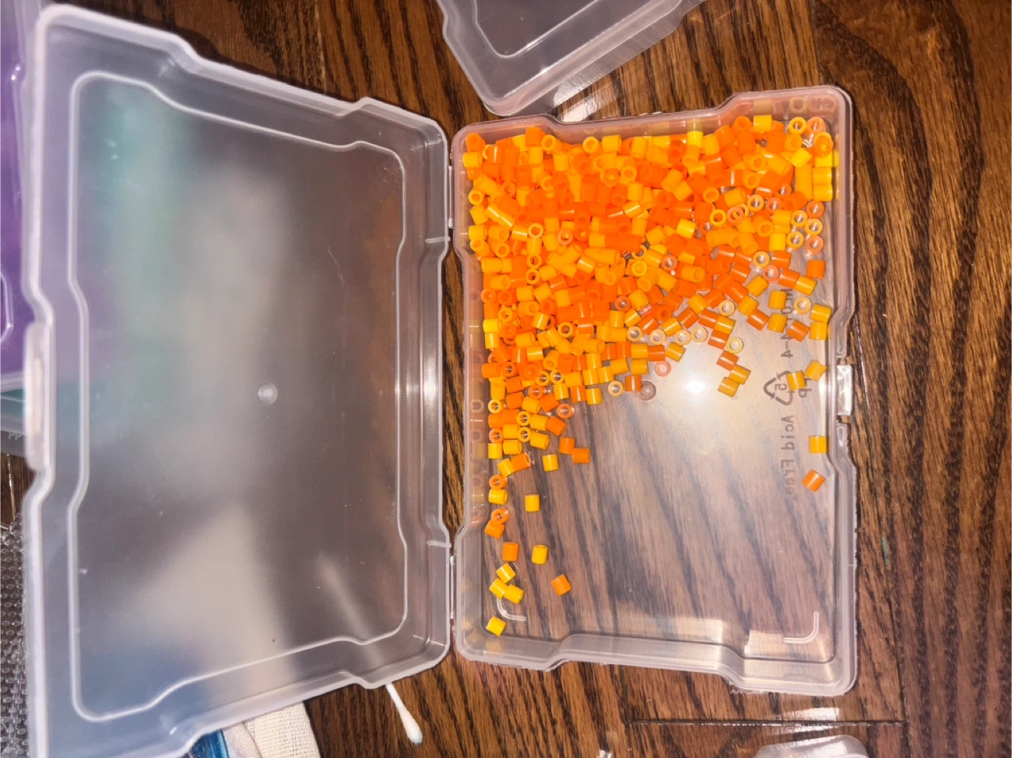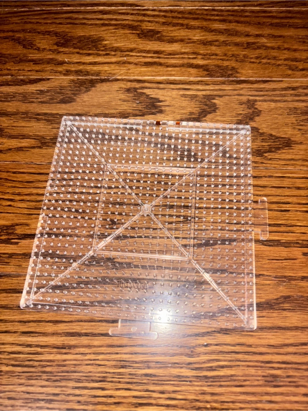 Comes with a clear square pegboard and a large assortment of Perler beads in various colours, including orange and white. Beads are stored in a plastic container.