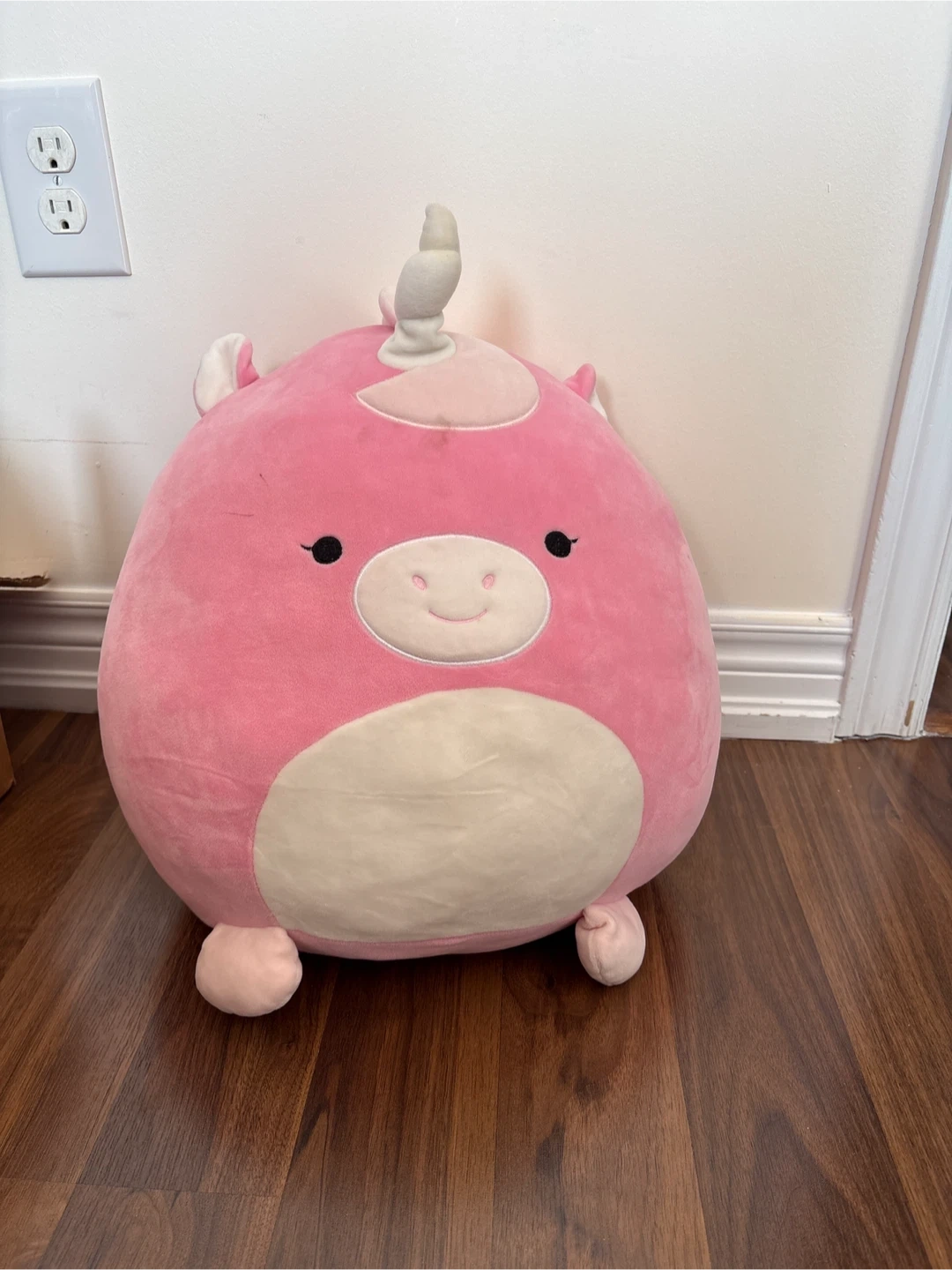This is a soft, pink Squishmallow plush toy shaped like a unicorn. It's a great cuddle buddy. The plush is made from a soft, velvety material.