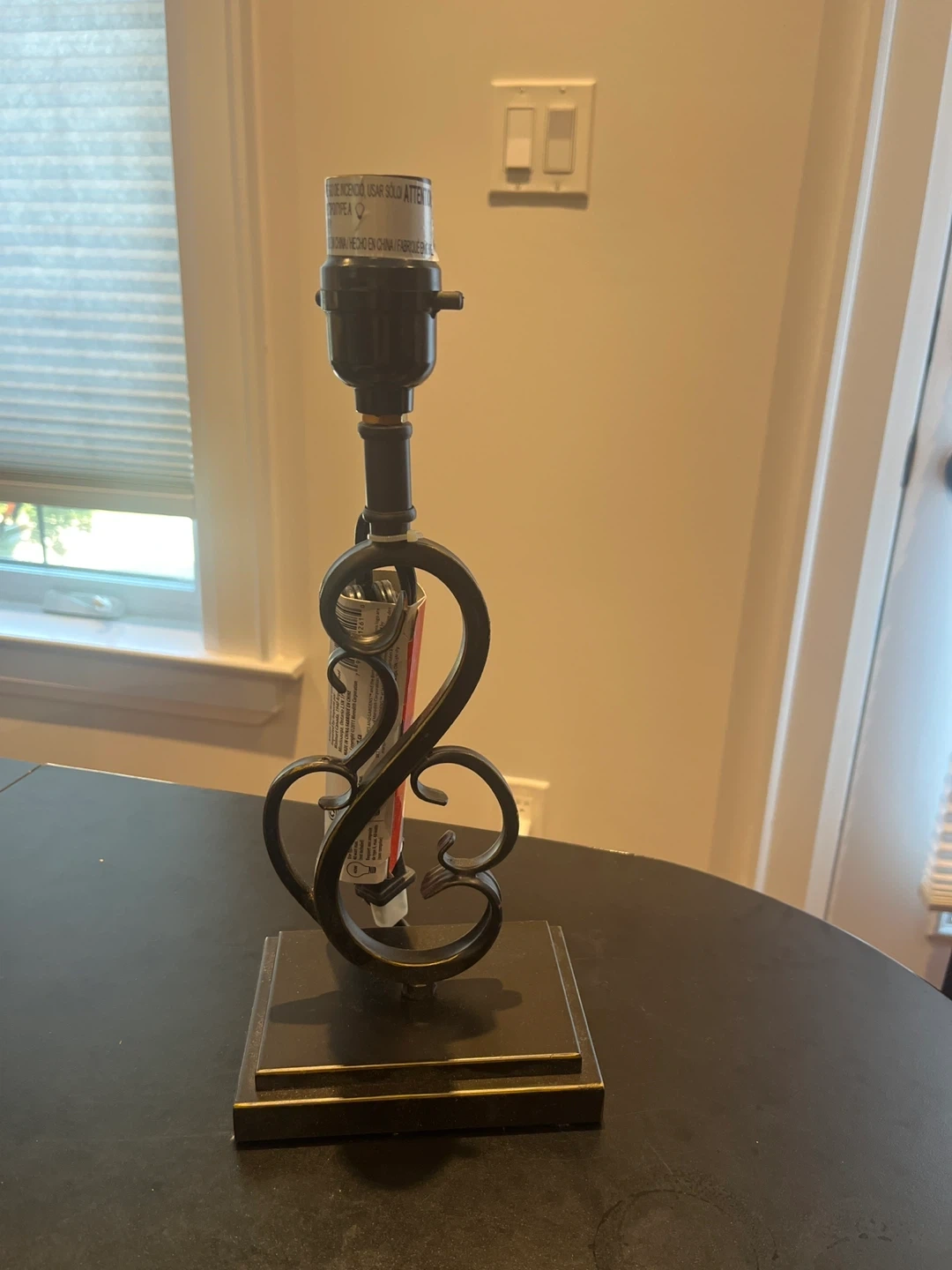A metal table lamp with a decorative design. It features a square base and a curly metal body. Perfect for adding a touch of elegance to any room