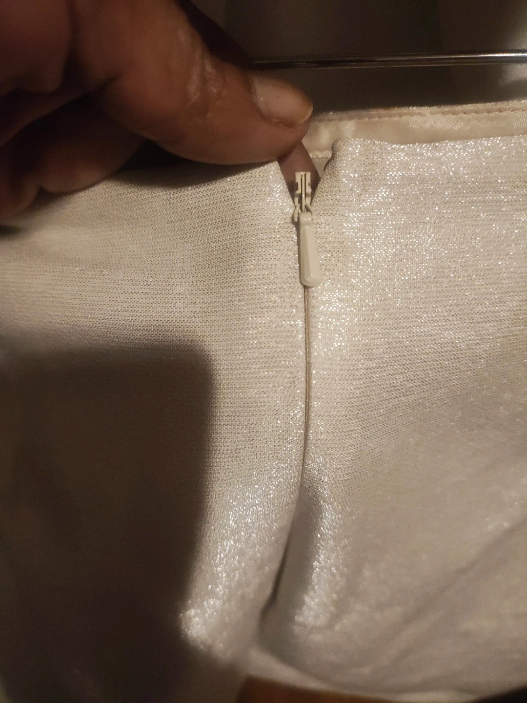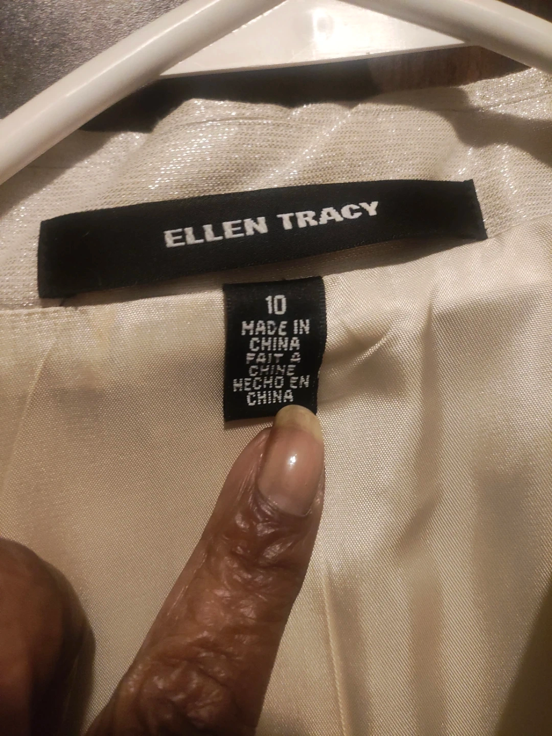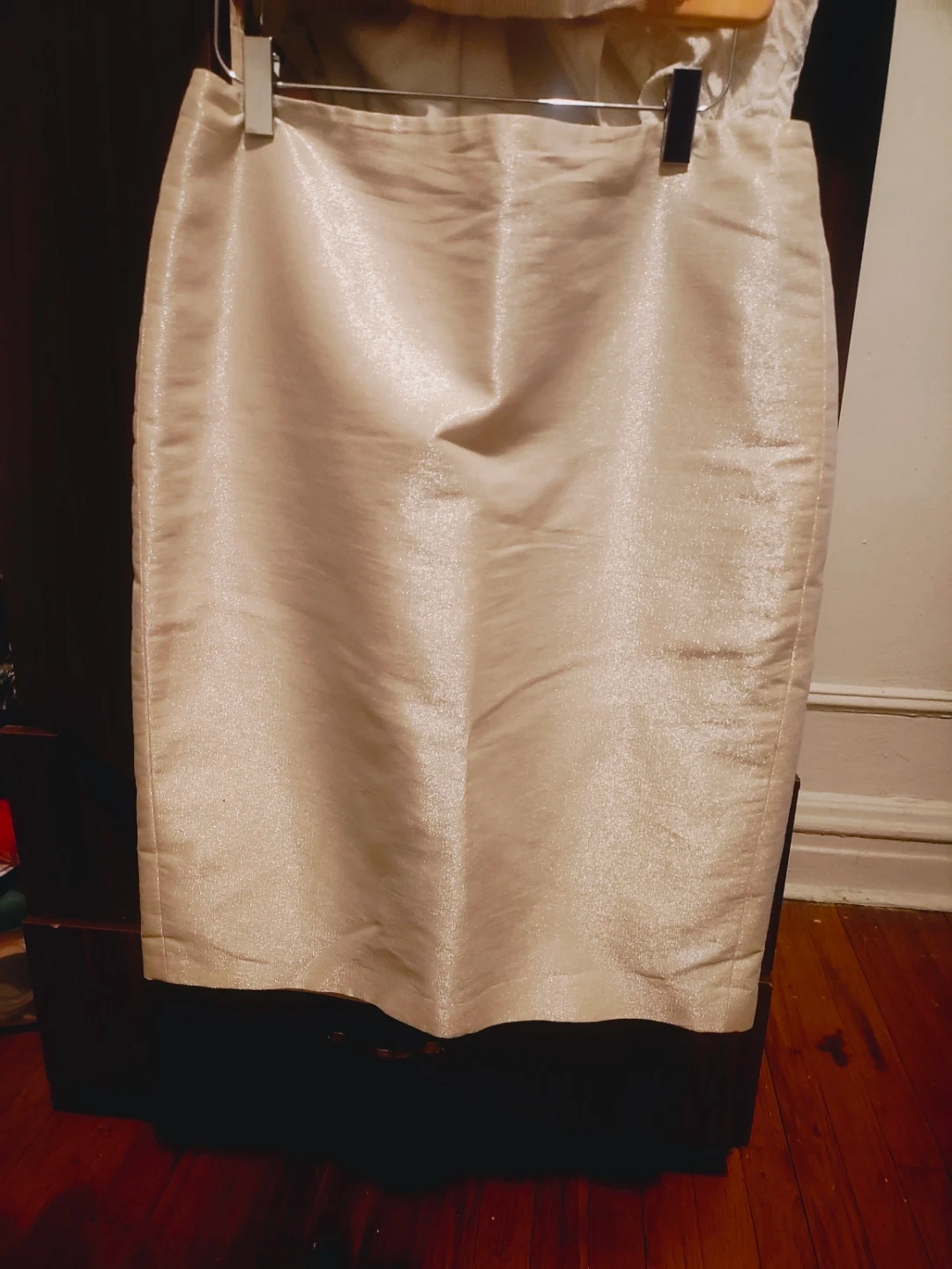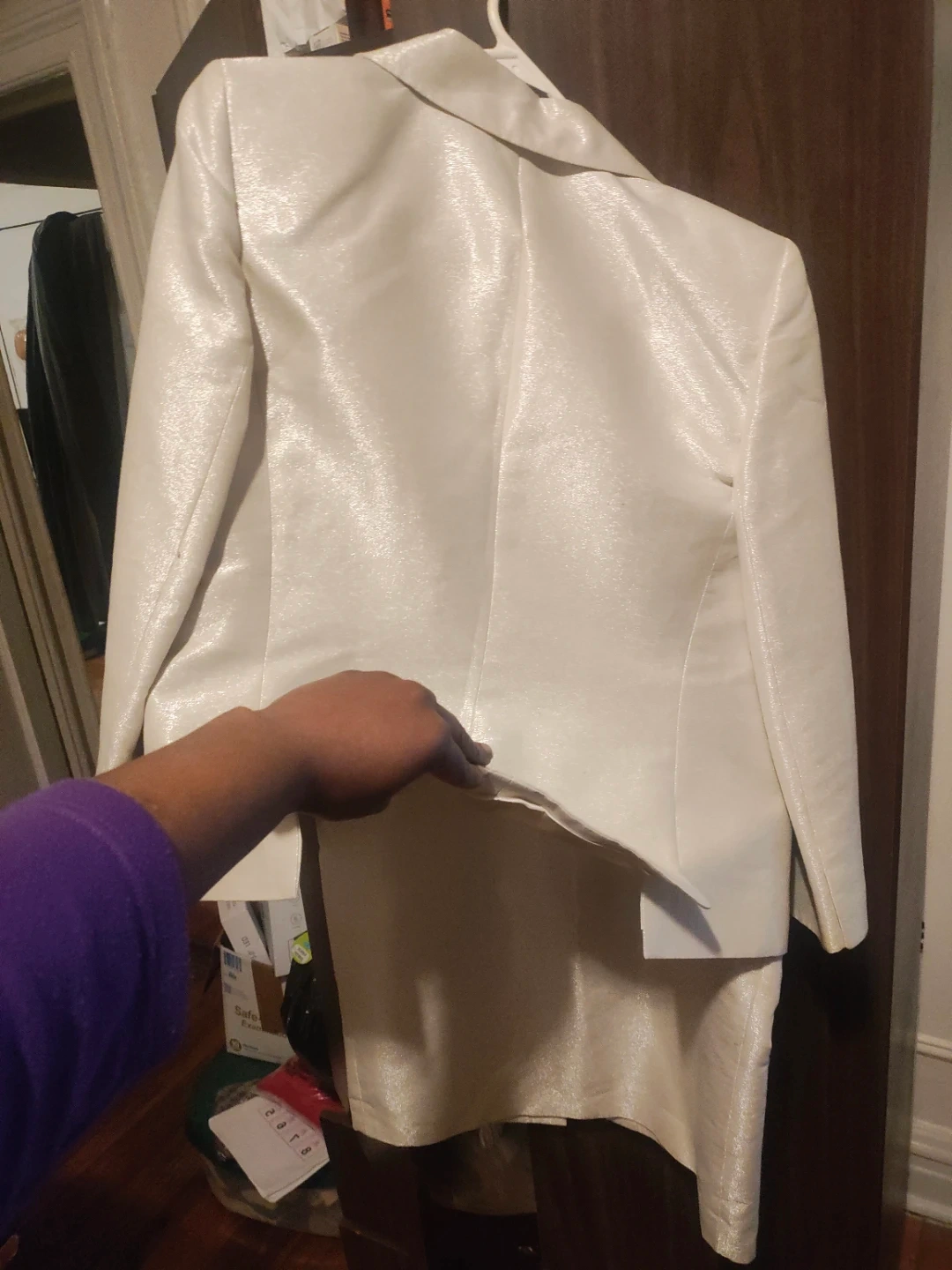 The blazer and skirt color, material is gorgeous. It has a beautiful shimmer and hasn't been worn just stored.