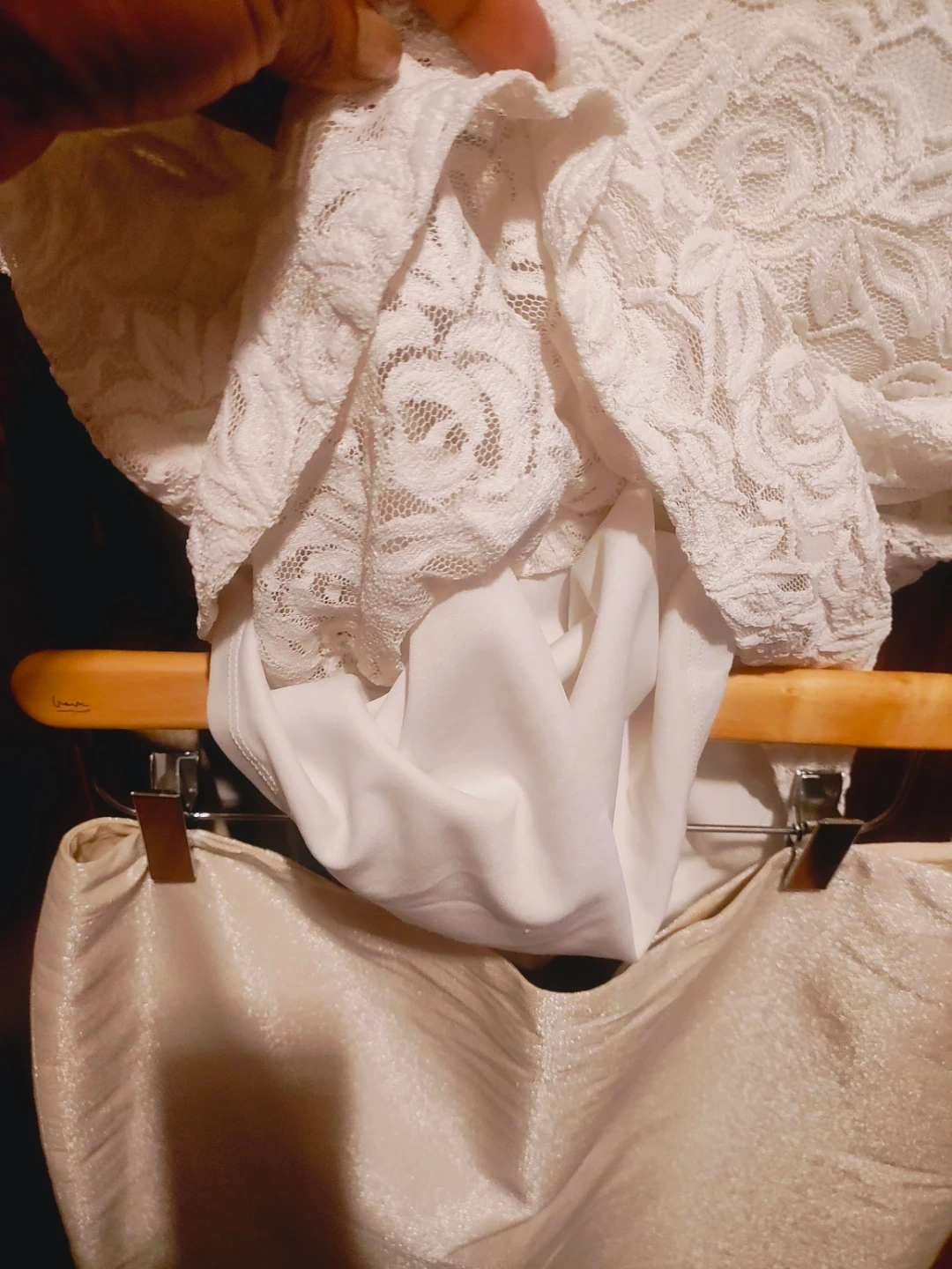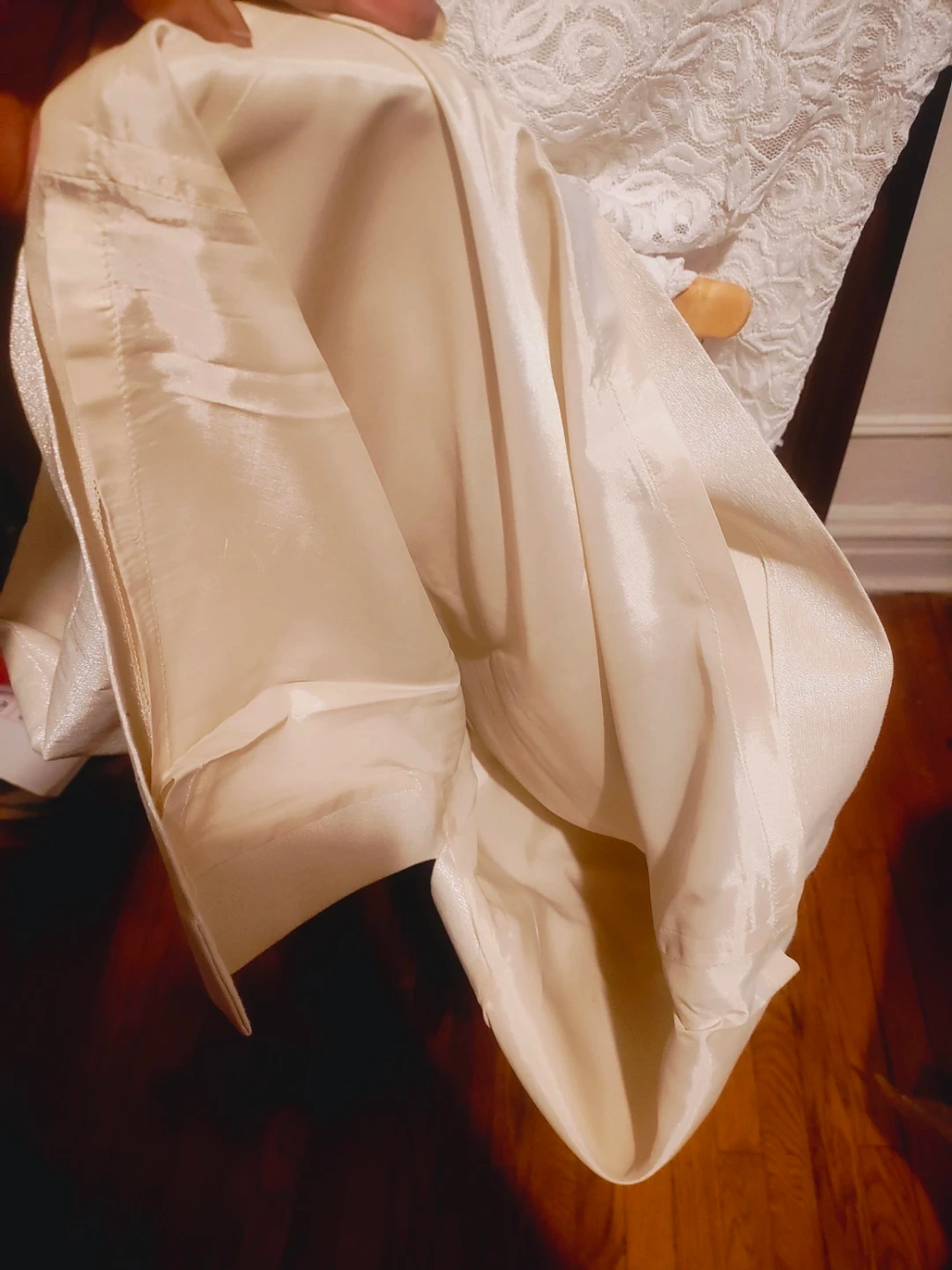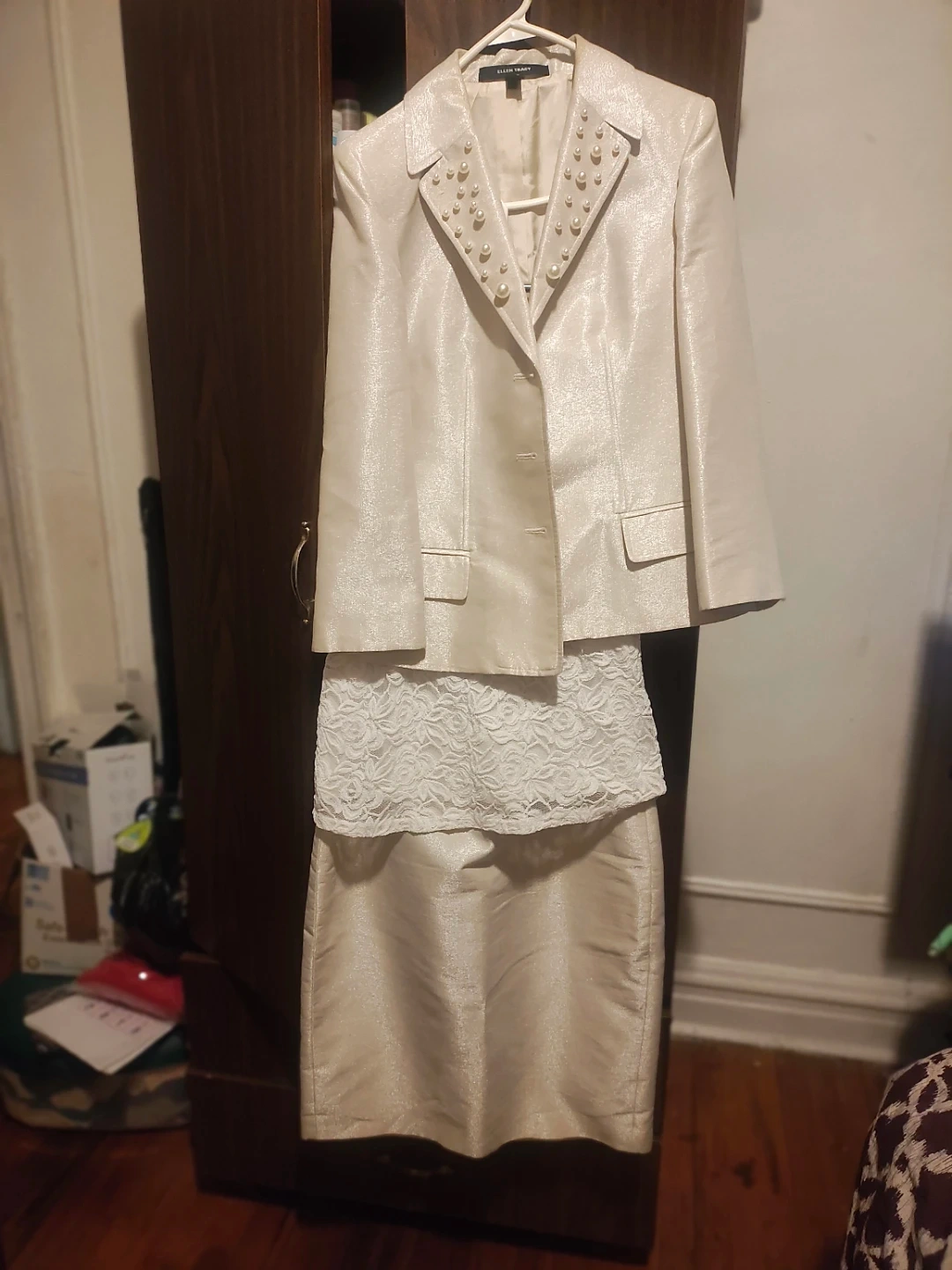 Here's a beautiful beige two piece skirt set with an added soft lacy blouse..both has lining, with DIY pearls added to blazer.
