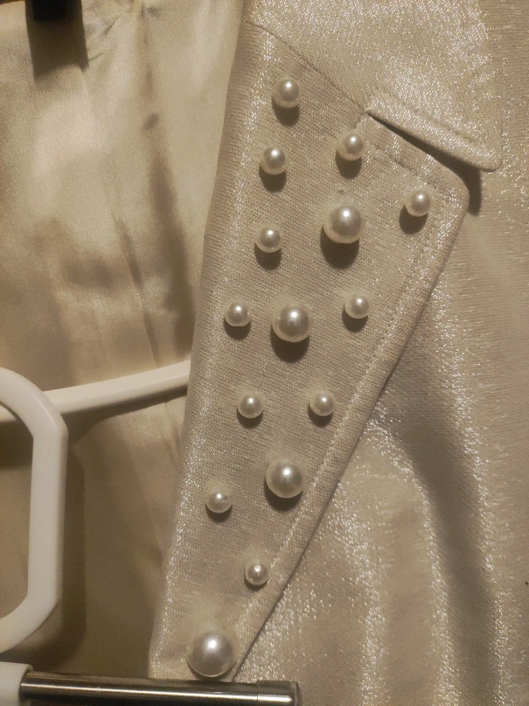 This is a three-piece women's outfit. It includes a pearl-beaded blazer, a white lace top, and a matching shimmering skirt. The blazer has a satin lining.