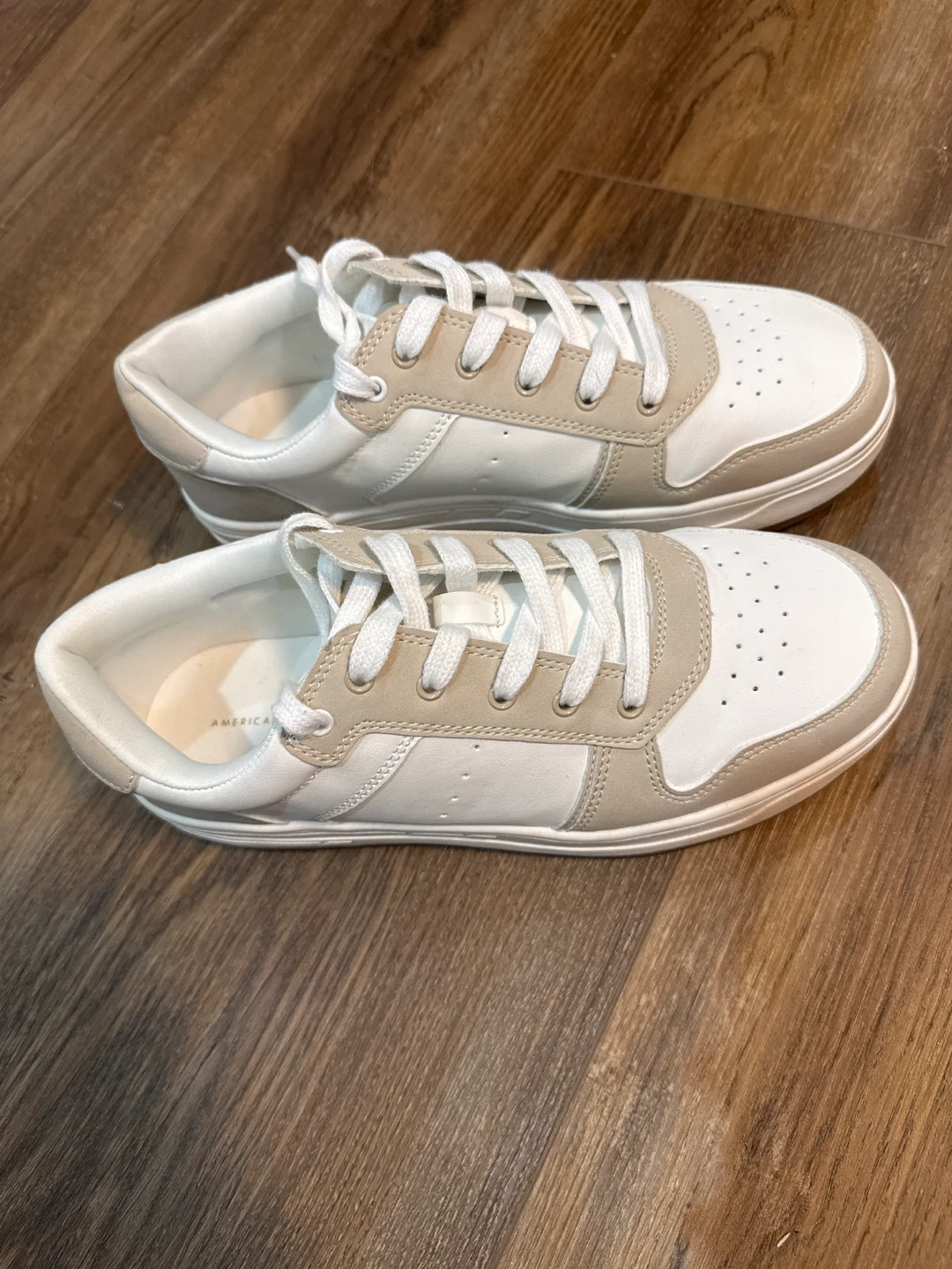 These American Eagle sneakers are white with tan accents. They're a classic low-top style. These would be great for casual everyday wear!