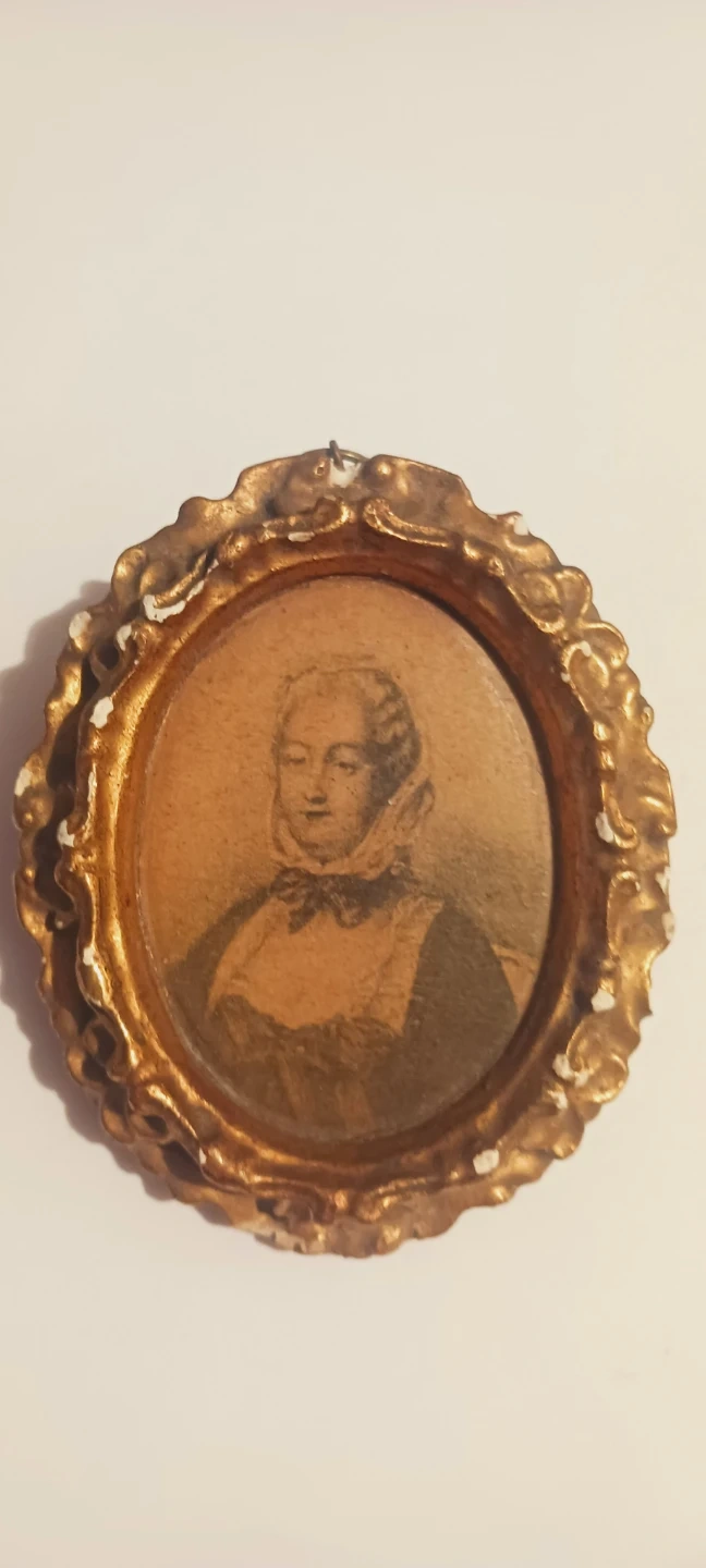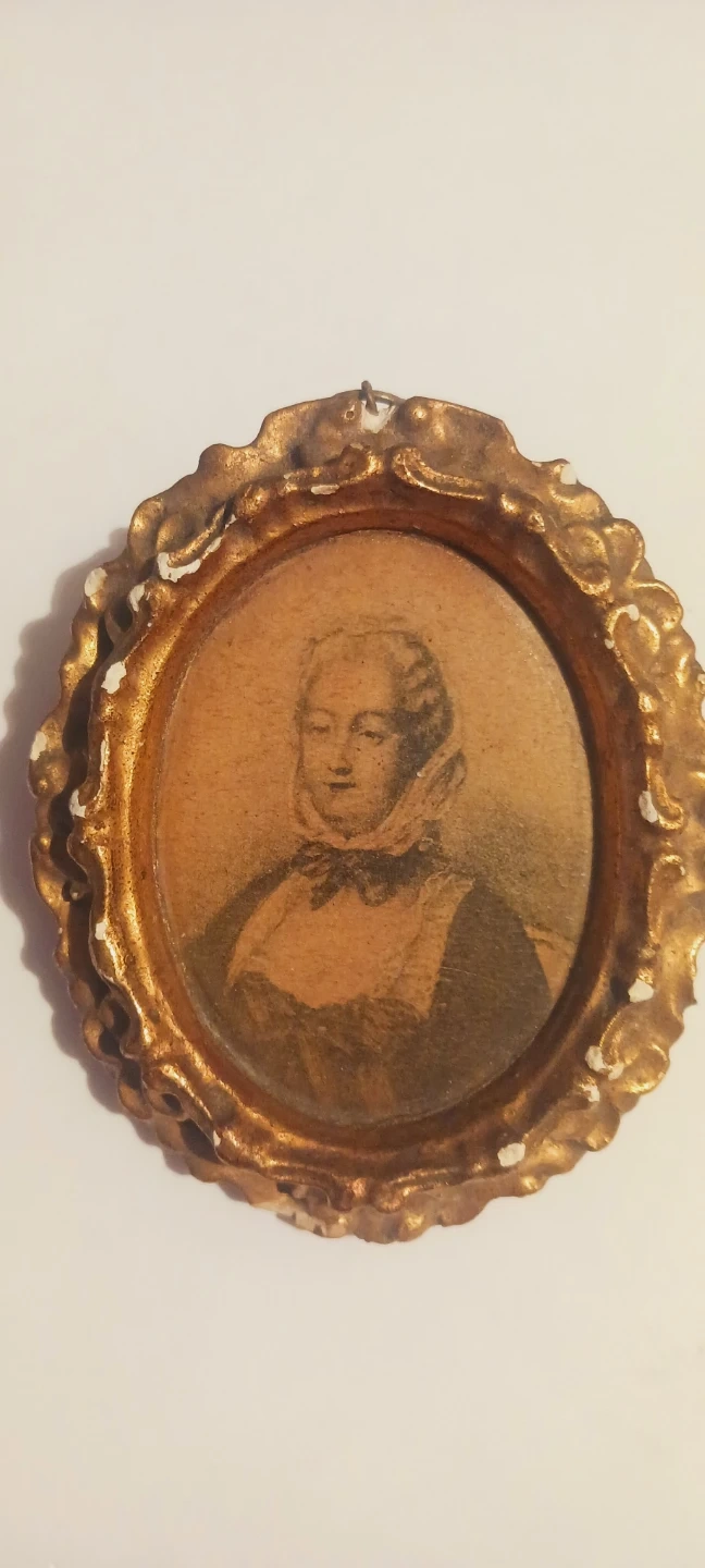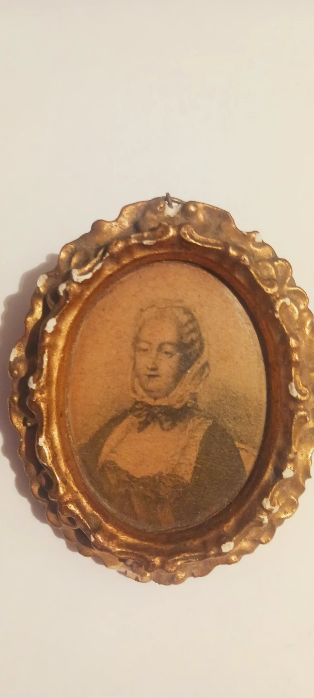 This is a vintage oval portrait miniature frame. It's ornate and has a distressed gold finish. The frame measures approximately 4 inches tall × 3 inches wide. Good condition. ALL MY PRICES ARE NEGOTIABLE !!